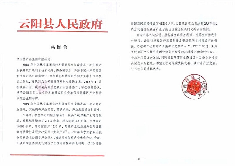 2018年11月,中国林产品集团有限公司与重庆市云阳县政府签订了帮扶框架协议,将云阳县芸山农业开发有限公司(以下简称“帮扶企业”)作为公司的三峡库区产业扶贫示范企业,并开展了为期三年的扶贫助农工作。所属中林融资租赁公司通过保理、融资租赁等金融服务参与到扶贫工作中,协助帮扶企业完成种苗培育、有机肥购买、包装箱购买、村民田地租金、菊花收购款支付等事宜,解决了其燃眉之急,助力企业扶农、助农。三年来,累计投放扶贫资金共计3000余万元,菊花种植规模增加2.1万余亩,涉及农户19000余户,带动贫困户1236户;目前云阳全县菊花种植产业涉及18个乡镇、41个村(社区),菊花产业已经成为云阳县推动高质量打赢脱贫攻坚的“黄金产业”。