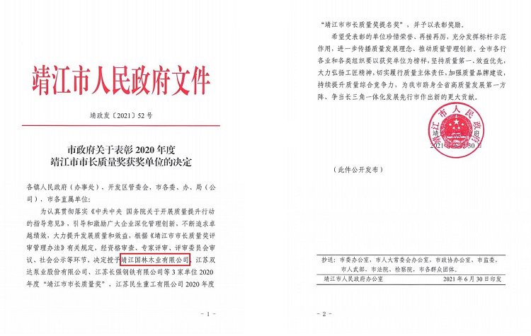 近日,靖江市人民政府发文公布了2020年度靖江市市长质量奖名单,公司所属靖江国林木业有限公司,作为靖江市首位入选企业,被授予“靖江市市长质量奖”殊荣。