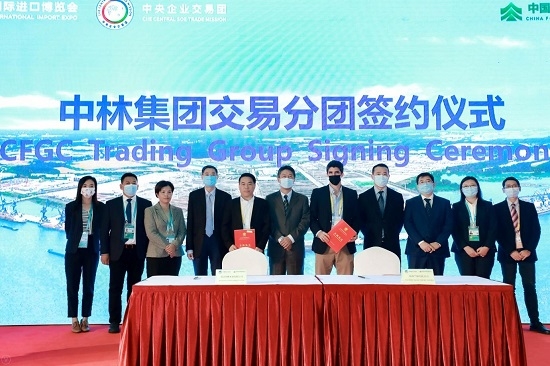 在进博会期间举行的中林集团交易分团签约仪式上,靖江国林公司与新西兰帕玛氏(PALMERS)公司成功签署价值2亿美元的进出口订购协议,涵盖进口原木板材、木结构配件、环保净水处理系统装置及木结构系列绿色低碳产品等。