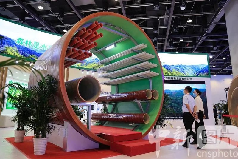 你听说过竹子能做压力管道、高铁车厢吗?在环境服务专题展区,中国林业集团在企业展台前,摆放了一根直径达3.6米的竹缠绕管廊,其原材料就是竹子。