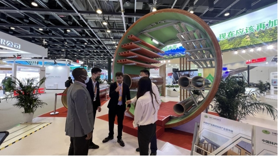 当提及产品的材质是竹子时,不同领域、不同年龄的观众们更是兴致盎然地了解这一新型的绿色低碳产品。既有长者感叹国家技术的进步,也有小朋友在管道管廊旁嬉戏玩耍。展区也吸引了国外友人前来驻足观看,也有众多观众慕名打卡。