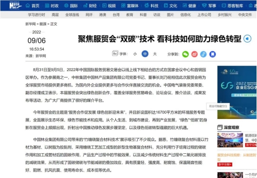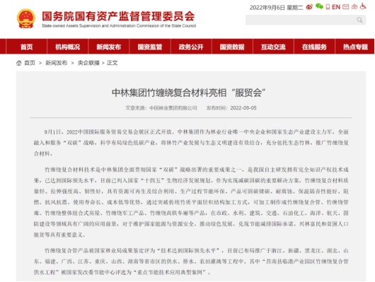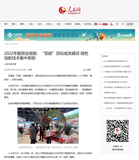 本届服贸会于8月31日至9月5日在京举办,中林集团竹缠绕复合材料在新设的环境服务专题展区首次亮相。展区现场不同孔径大小的竹缠绕管道管廊吸引了众多观众的目光,成为本次服贸会“网红打卡地”之一!