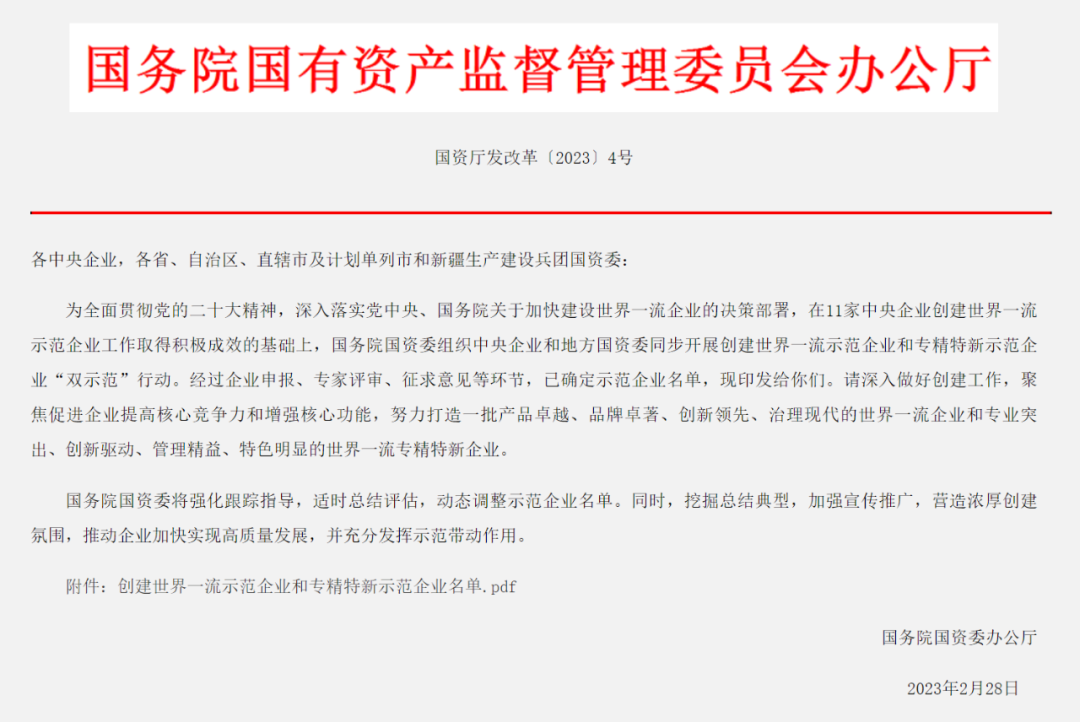 创建世界一流专精特新示范企业,是国务院国资委深入贯彻党中央、国务院关于加快建设世界一流企业决策部署,深化创建示范、管理提升、价值创造、品牌引领“四个专项行动”的重要内容,旨在加快建设一批主导全球产业链供应链价值链的龙头企业。