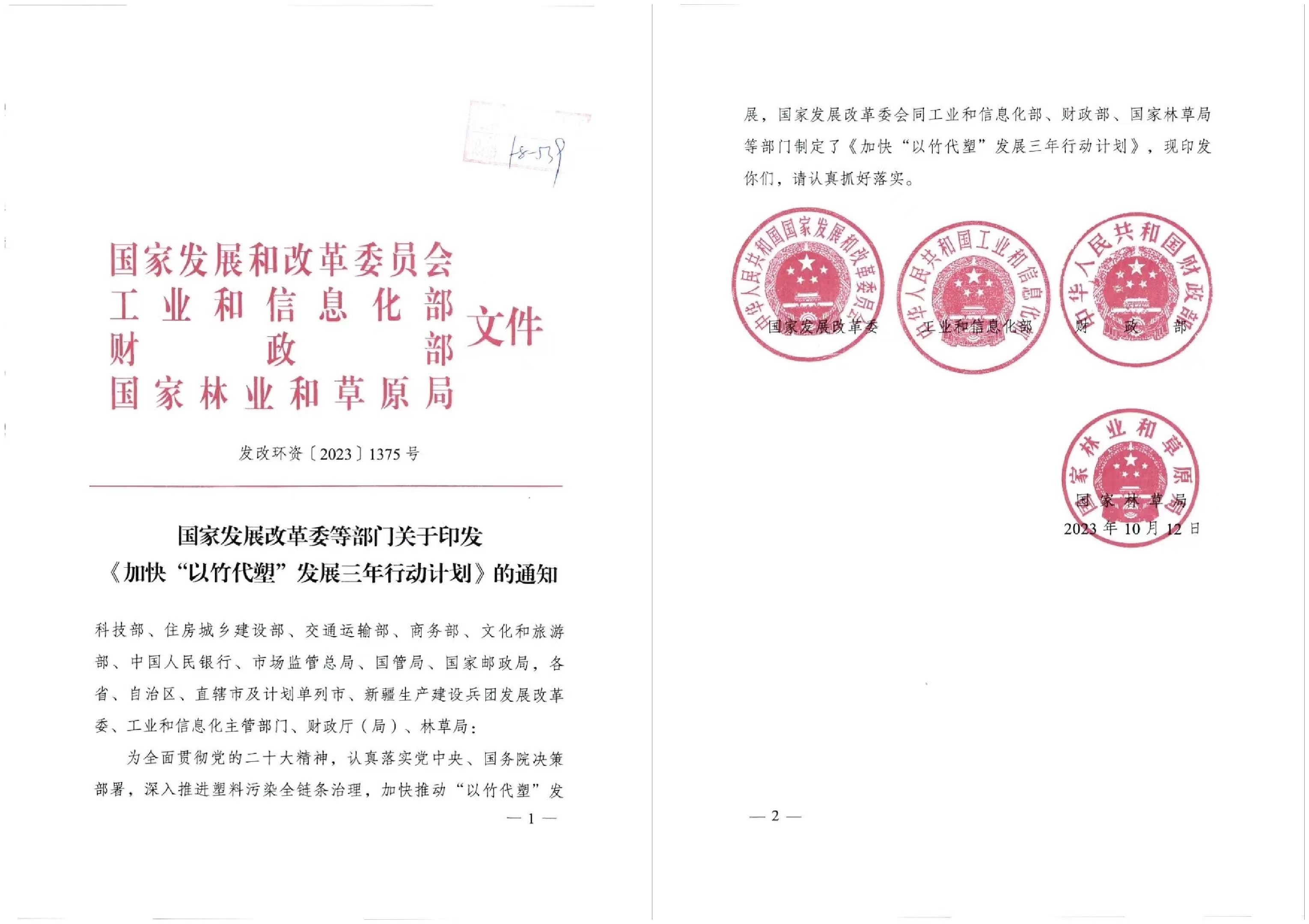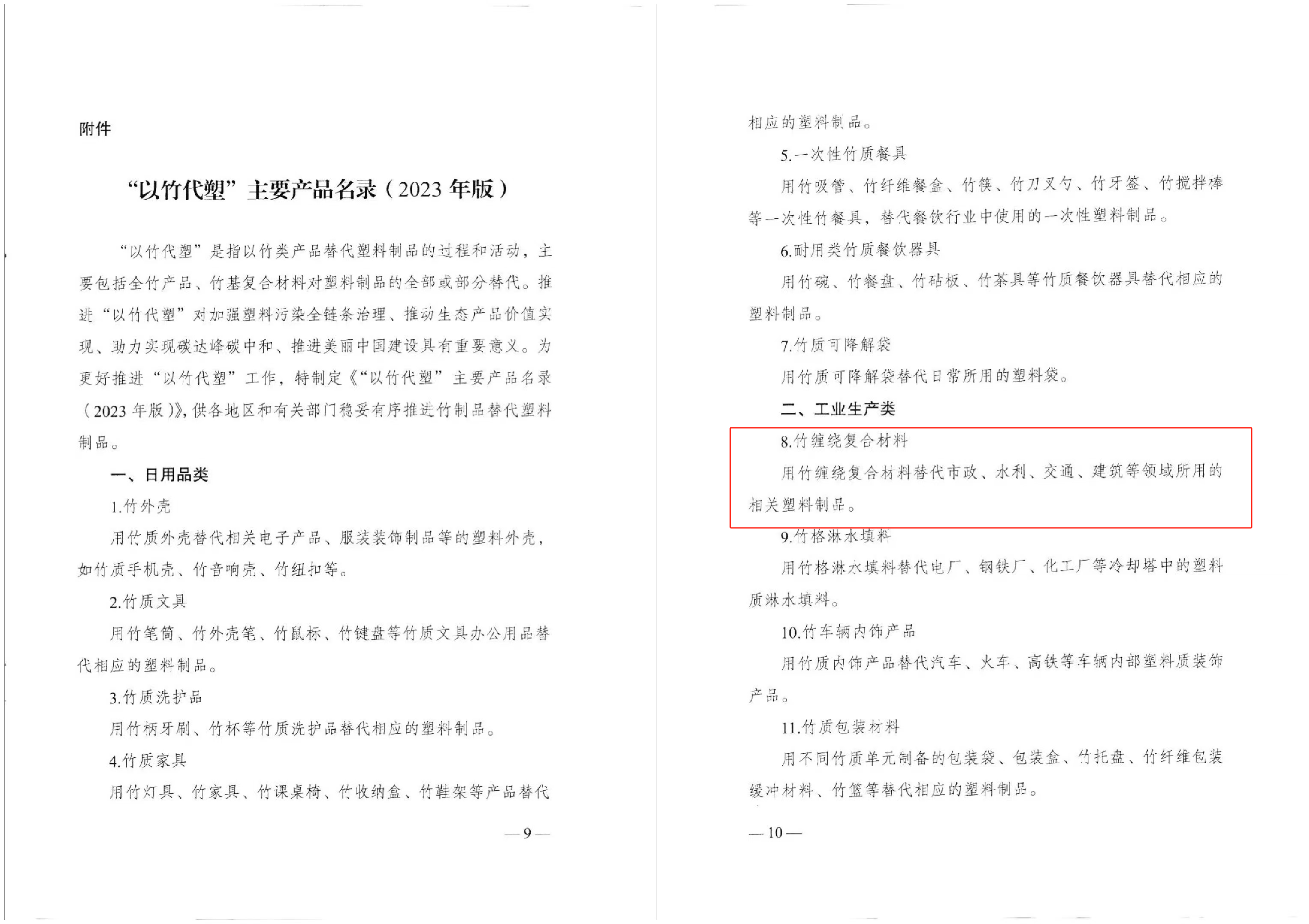 近日,国家发展改革委会同工业和信息化部、财政部、国家林草局等部门制定了《加快“以竹代塑”发展三年行动计划》,鼓励竹缠绕复合材料替代工业生产、建筑建材等重点场景领域的相应塑料制品,并发布了“以竹代塑”主要产品名录。作为绿色低碳的新型生物基材料,竹缠绕复合材料入选名录。