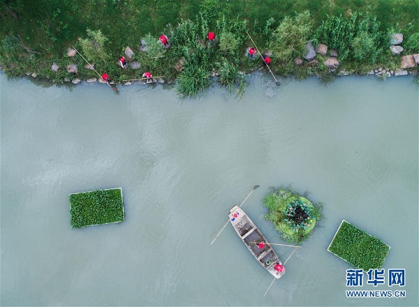 在浙江省长兴县刘家渡河道南太湖段,河长带领专职保洁人员进行日常的乡村河道护理(2017年10月13日摄)。新华社记者 徐昱 摄