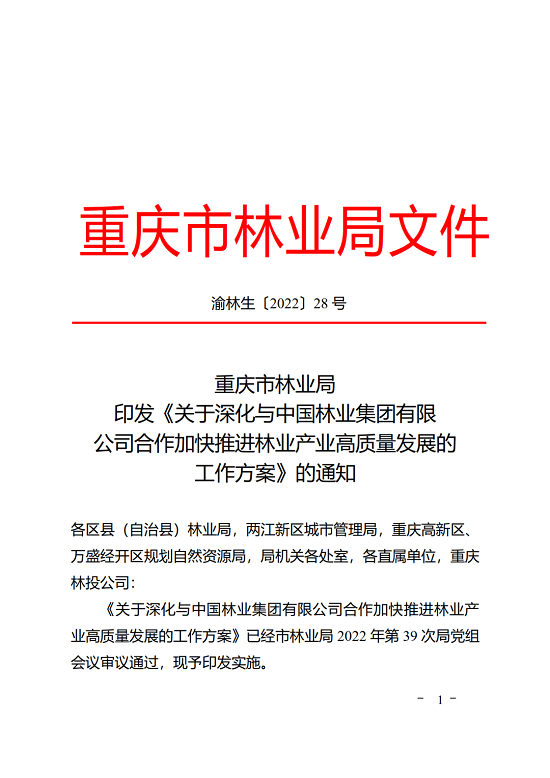 为认真落实中国林业集团与重庆市人民政府有关深化合作事宜,加快推进重庆林业产业高质量发展,近日,重庆市林业局印发《关于深化与vwin网址链接 合作加快推进林业产业高质量发展的工作方案》。