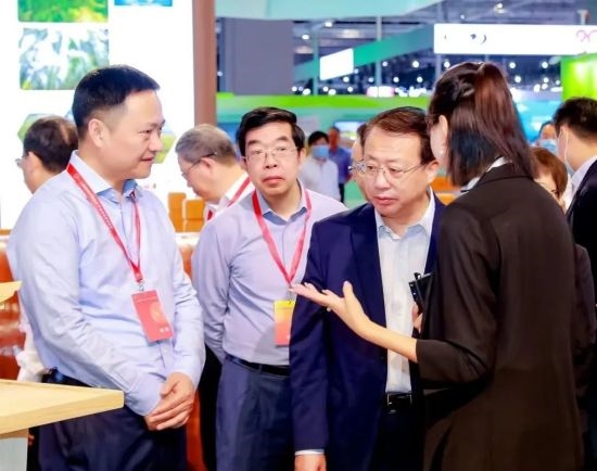 开幕式当天上午,中林集团党委书记、董事长余红辉陪同上海市委副书记、市长龚正,国家发改委副主任杨荫凯参观中林集团展厅,并为大家详细介绍中林集团近年来在森林固碳、林业战略性新兴产业、生态产品价值实现等领域的特色亮点与技术成果。参观嘉宾们对中林集团近年来在贯彻落实国家"双碳"战略,推进林业产业绿色低碳转型发展取得的成绩表示肯定。