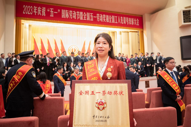 全国劳动模范晏文娟作为中林集团代表,在人民大会堂领取全国“五一劳动奖状”。