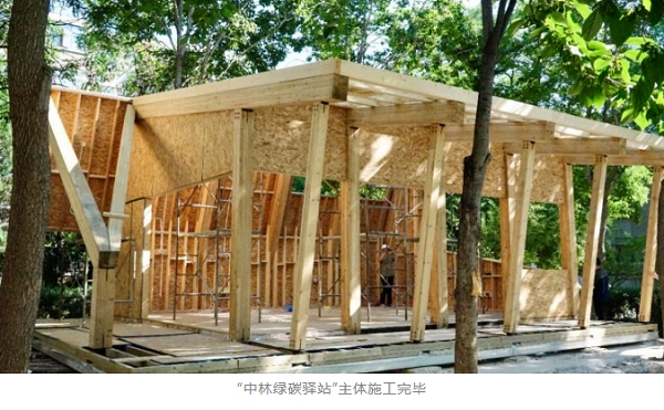 近日,由中林集团和北京林业大学共同研发的近零能耗混合木结构示范工程“中林绿碳驿站”已完成主体结构施工,即将在北京林业大学校园图书馆东侧落户,为校园的秋色增添一份“木”之暖意。