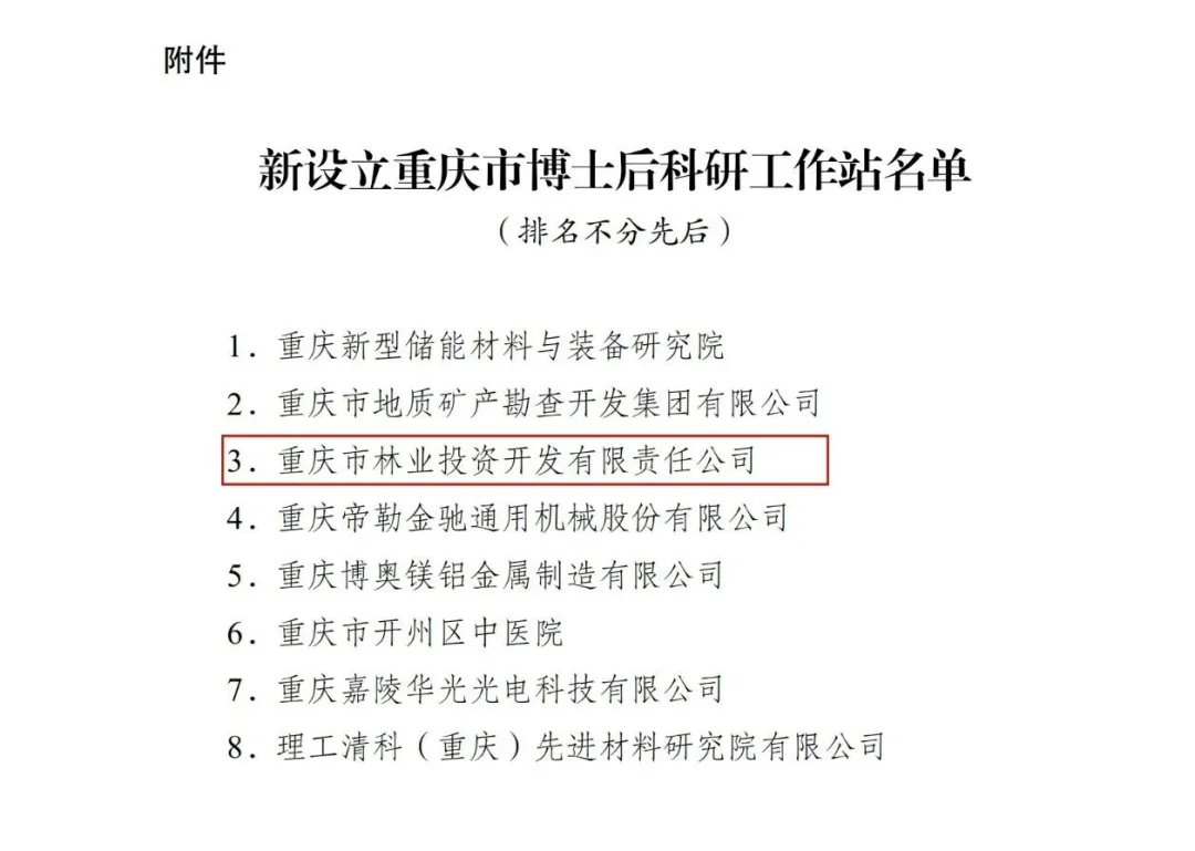 2024年,是重庆林投公司强化科技赋能创新驱动、提升创新资源配置效率,以科研力量赋能国储林建设样板的关键一年。本次成功获批设立博士后科研工作站,是对重庆林投公司科研创新能力和高层次人才培养能力的高度认可。通过该平台,公司将更好地促进国储林项目科技成果的转移转化,因地制宜推进林蜜、林药、林禽、老鹰茶、甜茶、天麻等林下经济产业发展,推动实施疫木安全处置与综合利用科技示范项目,实现松材线虫病疫木多样化处置和安全高值化利用,培育林业新质生产力,搭建起一个创新的高地,为整合科技资源、提升企业核心竞争力提供有力支撑。