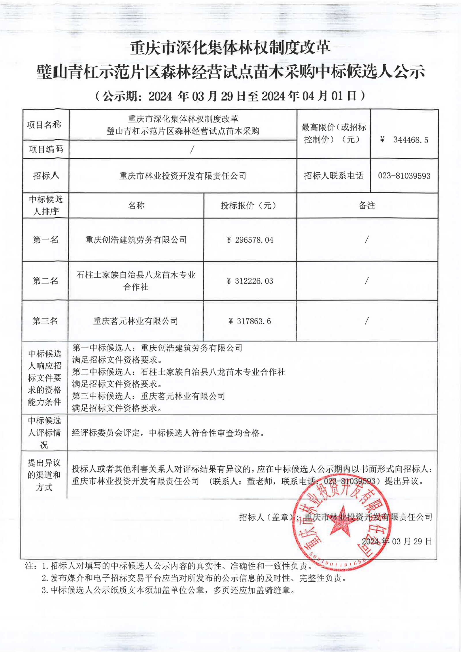 中标候选人公示重庆市深化集体林权制度改革璧山青杠示范片区森林经营试点苗木采购项目