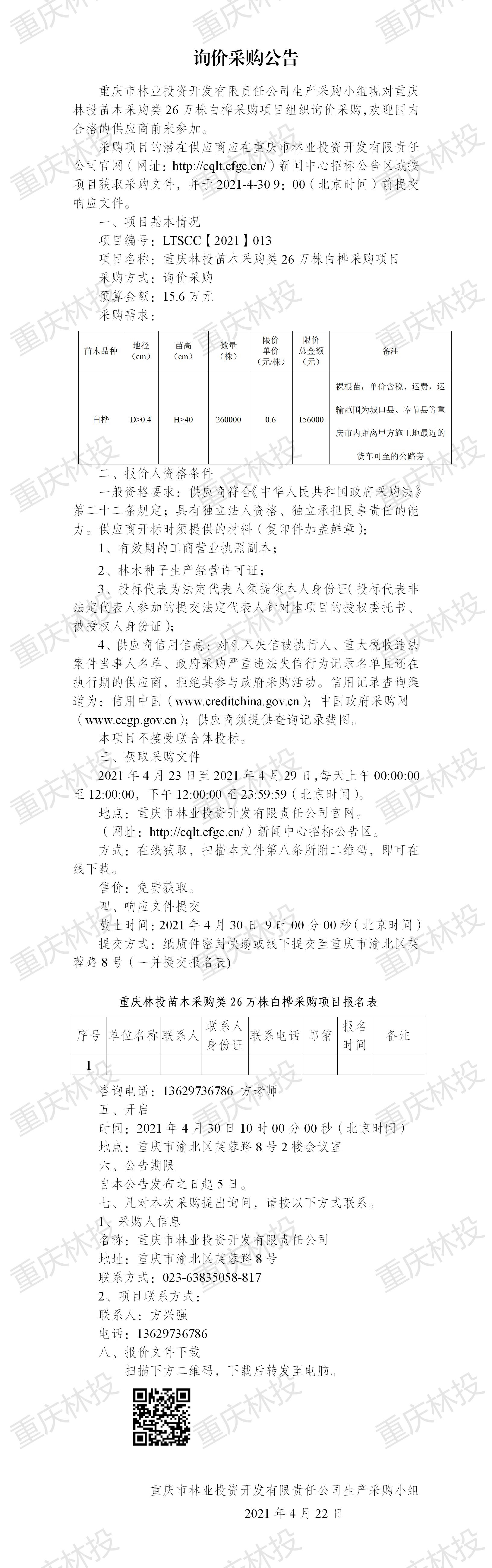 询价采购公告LTSCC【2021】013