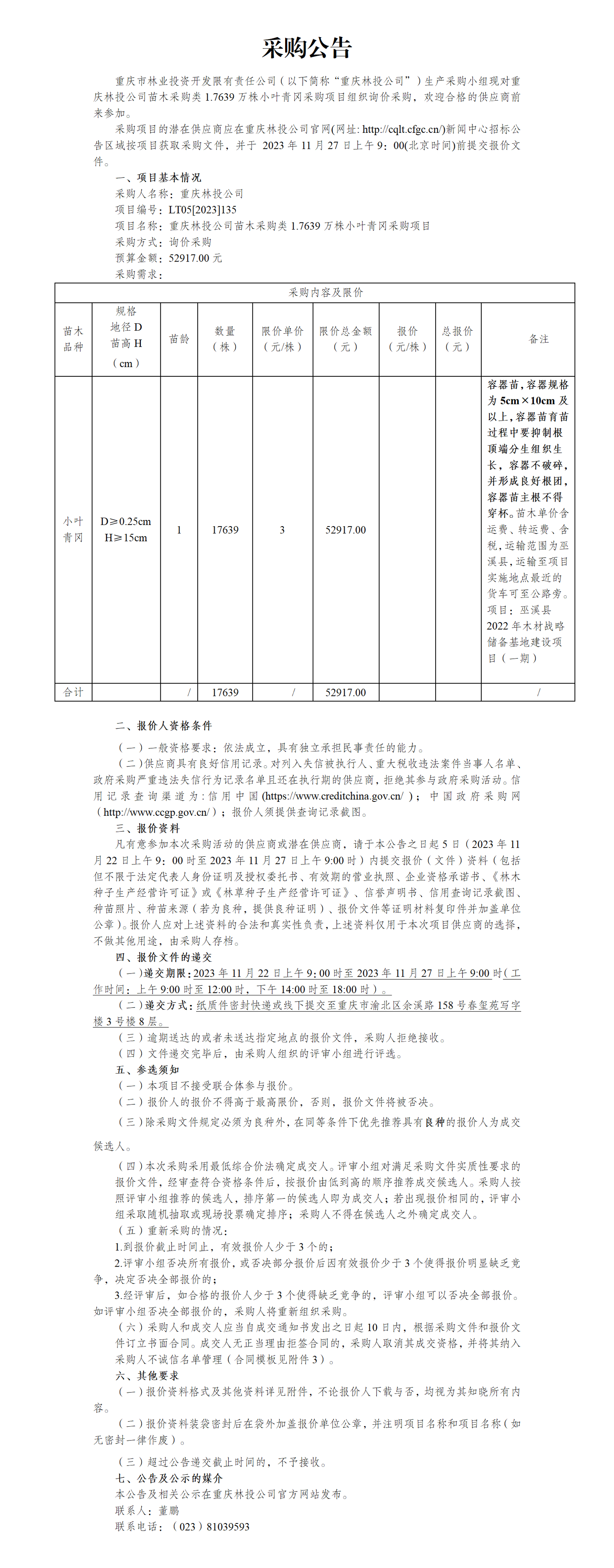 采购公告重庆林投公司苗木采购类1.7639万株小叶青冈采购项目
