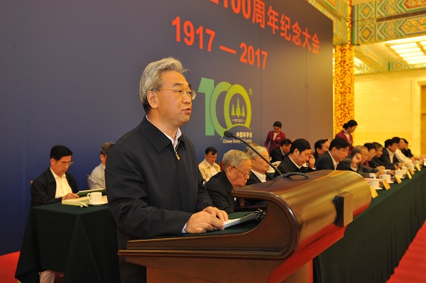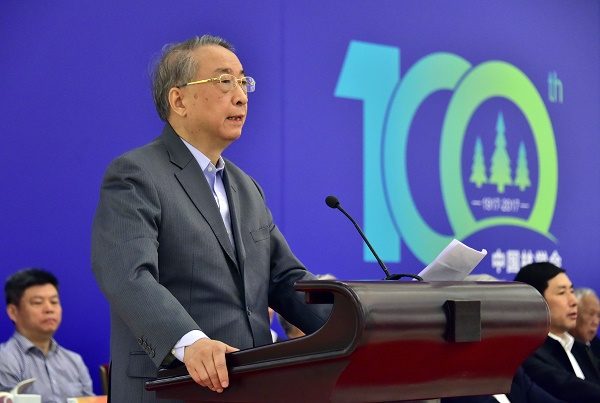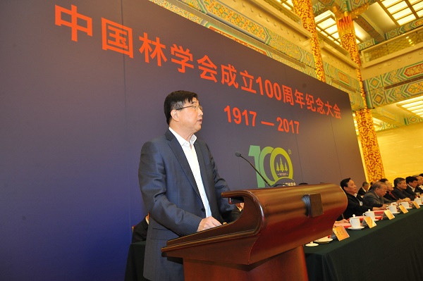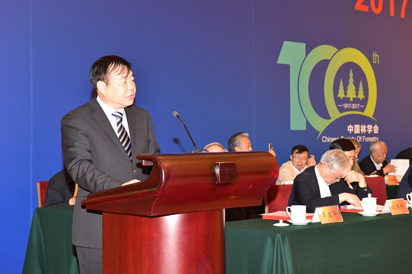 国家林业局局长张建龙因在内蒙古大兴安岭森林火灾扑火前线,未能出席大会。国家林业局副局长彭有冬宣读了张建龙局长的讲话。张建龙局长在书面讲话中指出,学会成立100年来,始终秉承“建设林业、服务祖国”的宗旨,坚持与民族共命运、与时代同步伐,不忘初心,砥砺前行,为中国林业事业作出了突出贡献;提出的许多重要战略思想,对推动林业改革发展产生了深远影响;团结了一大批林业科技精英,推动了林业科技的繁荣和发展;坚持以传播林业科技知识为己任,调动了社会力量积极投身祖国的林业事业;坚持服务基层群众,促进了林业生产发展和农民就业增收。形成和发扬了以林报国、振兴中华的爱国精神,实事求是、追求真理的科学精神,热爱林业、不懈奋斗的敬业精神,百折不挠、勇于拼搏的进取精神,甘当人梯、大公无私的奉献精神,激励着一代又一代务林人奋勇向前,为中国林业事业而努力奋斗。他希望中国林学会和广大林业科技工作者以中国林学会成立100周年为契机,深入学习贯彻习近平总书记系列重要讲话精神,紧紧围绕国家发展战略和林业中心工作,弘扬优良传统,强化责任担当,树立雄心壮志,勇攀科学高峰,更好地担负起科技兴林的历史重任,做到始终坚持服务国家大局,全力推动林业科技创新,大力培养举荐科技人才,广泛传播生态文明理念,切实加强学会自身建设,为我国林业现代化建设贡献更多力量。