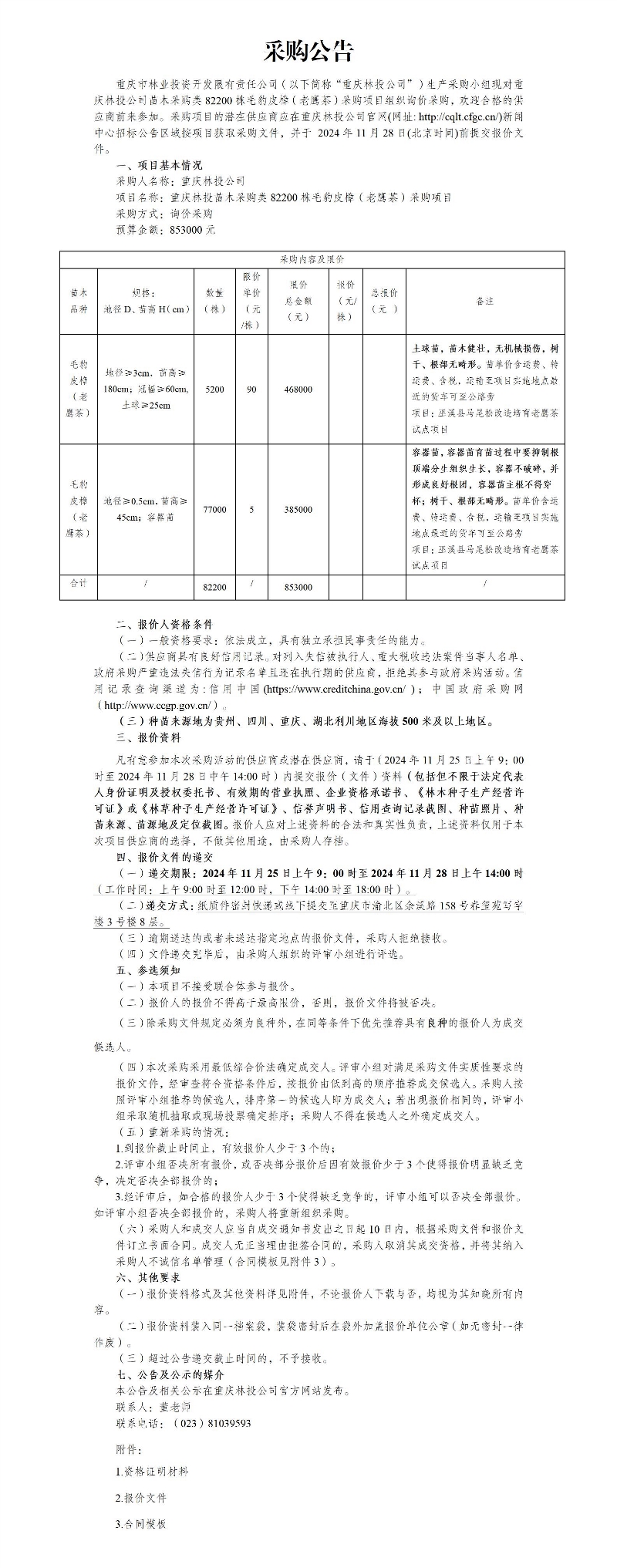 重庆林投公司苗木采购类82200株毛豹皮樟(老鹰茶)采购项目采购公告