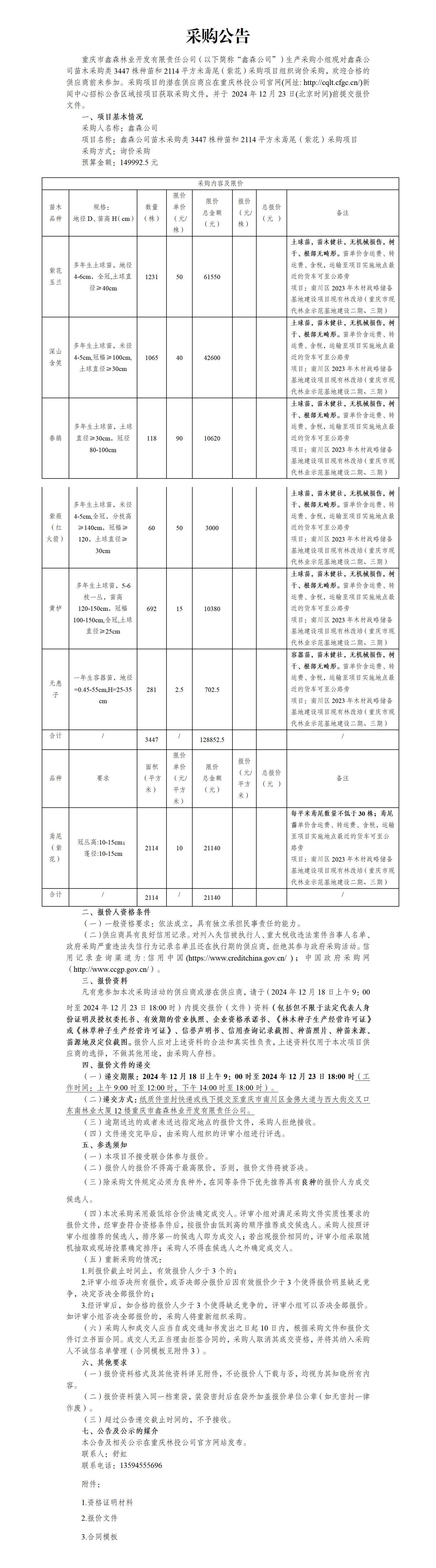 重庆市鑫森林业开发有限责任公司苗木采购类3447株种苗和2114平方米鸢尾(紫花)采购项目采购公告