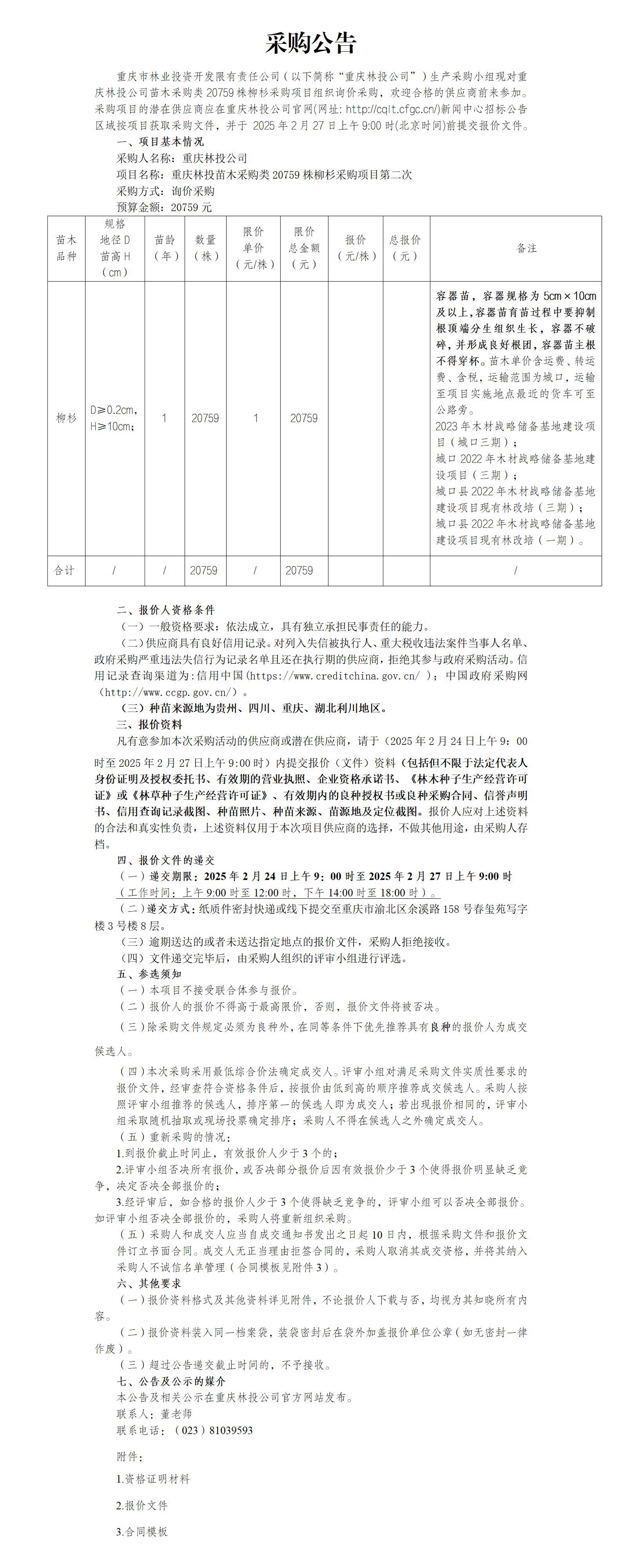 重庆林投苗木采购类20759株柳杉采购项目第二次采购公告