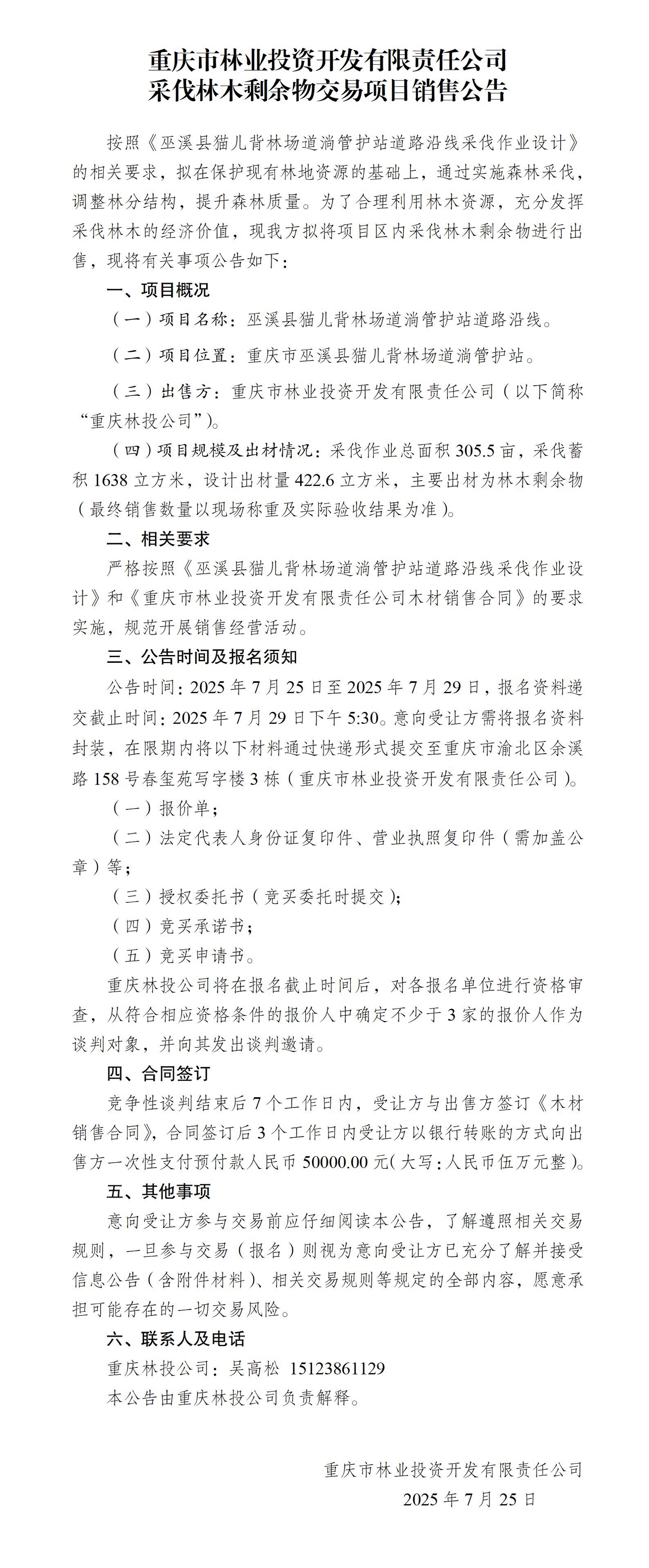 重庆市林业投资开发有限责任公司 采伐林木剩余物交易项目销售公告