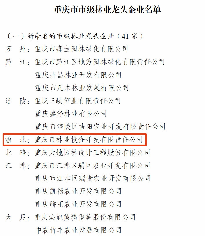 不久前,重庆市林业局正式公布了2019—2021年度市级林业龙头企业名单,重庆市林业投资开发有限责任公司成功入选。