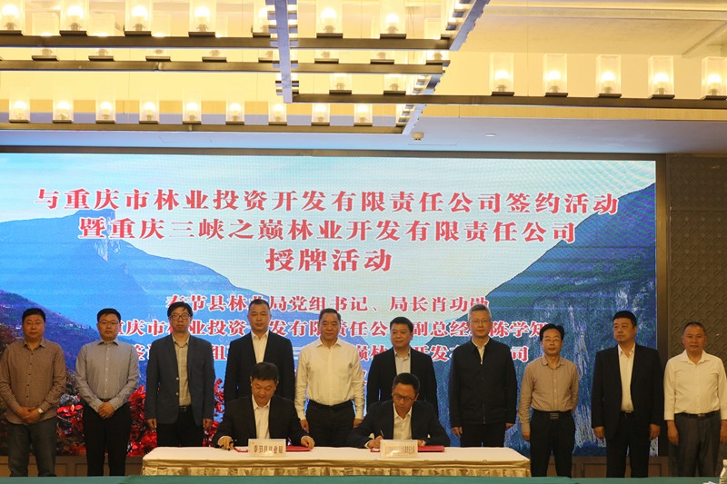 4月29日,重庆市林业投资开发有限责任公司与奉节县人民政府签订共同推进林业生态暨国家储备林项目建设合作协议及重庆三峡之巅林业开发有限责任公司授牌成立活动在重庆市奉节县隆重举行。奉节县县委书记杨树海致辞并为重庆三峡之巅林业开发有限公司授牌,县委副书记、县长祁美文主持会议,市林业局党组成员王定富,公司副总经理罗廉、奉节县县委副书记钟红兵,县委常委、副县长李品雄,县人大常委会副主任龚举品等出席活动。