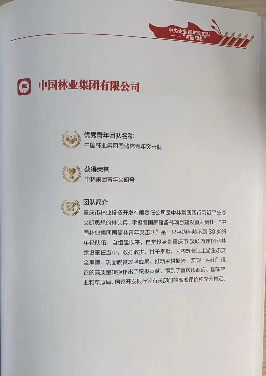 重庆市林业投资开发有限责任公司是中林集团践行习近平生态文明思想的排头兵,承担着国家储备林项目建设重大责任。“中国林业集团国储林青年突击队”是一支平均年龄不到30岁的年轻队伍,自组建以来,自觉投身到重庆市500万亩国储林建设重任当中,敢打敢拼、甘于奉献,为构筑长江上游生态安全屏障、巩固脱贫攻坚成果、推动乡村振兴,实现“两山理论”的高质量转换作出积极贡献,得到了重庆市政府、国家林业和草原局、国家开发银行等有关部门的高度评价和充分肯定。