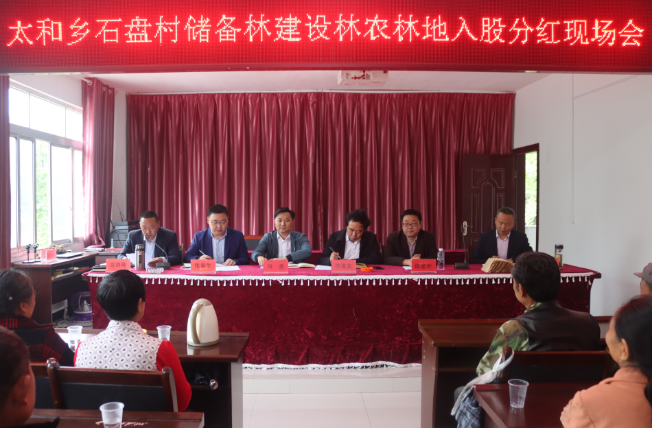 5月26日,重庆三峡之巅公司在奉节县太和乡石盘村召开储备林建设林农林地入股分红现场会,为石盘村一社的村民现场发放本年度的入股分红资金。