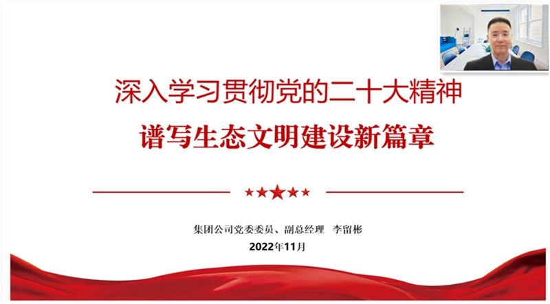 李留彬以“深入学习贯彻党的二十大精神 谱写生态文明新篇章”为主题,紧扣党的二十大报告原文,结合二十大赋予国资国企的新使命、新任务,从党的二十大主题和重大意义、过去五年的工作和新时代十年的伟大变革、以中国式现代化推进中华民族伟大复兴的使命任务、全面建设社会主义现代化国家的目标任务、党的二十大精神对集团未来发展的指导性意义五个方面进行深入讲解。