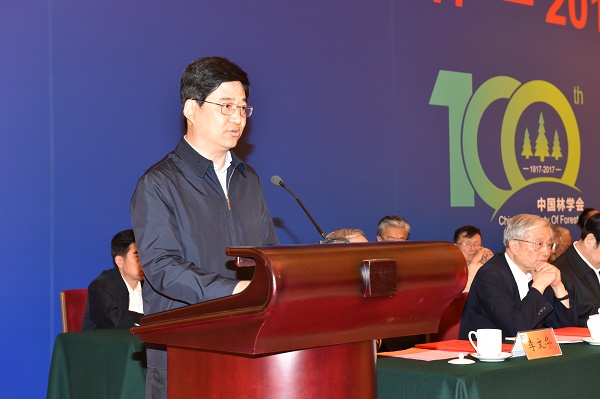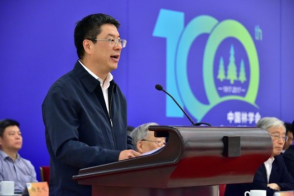 国家林业局局长张建龙因在内蒙古大兴安岭森林火灾扑火前线,未能出席大会。国家林业局副局长彭有冬宣读了张建龙局长的讲话。张建龙局长在书面讲话中指出,学会成立100年来,始终秉承“建设林业、服务祖国”的宗旨,坚持与民族共命运、与时代同步伐,不忘初心,砥砺前行,为中国林业事业作出了突出贡献;提出的许多重要战略思想,对推动林业改革发展产生了深远影响;团结了一大批林业科技精英,推动了林业科技的繁荣和发展;坚持以传播林业科技知识为己任,调动了社会力量积极投身祖国的林业事业;坚持服务基层群众,促进了林业生产发展和农民就业增收。形成和发扬了以林报国、振兴中华的爱国精神,实事求是、追求真理的科学精神,热爱林业、不懈奋斗的敬业精神,百折不挠、勇于拼搏的进取精神,甘当人梯、大公无私的奉献精神,激励着一代又一代务林人奋勇向前,为中国林业事业而努力奋斗。他希望中国林学会和广大林业科技工作者以中国林学会成立100周年为契机,深入学习贯彻习近平总书记系列重要讲话精神,紧紧围绕国家发展战略和林业中心工作,弘扬优良传统,强化责任担当,树立雄心壮志,勇攀科学高峰,更好地担负起科技兴林的历史重任,做到始终坚持服务国家大局,全力推动林业科技创新,大力培养举荐科技人才,广泛传播生态文明理念,切实加强学会自身建设,为我国林业现代化建设贡献更多力量。