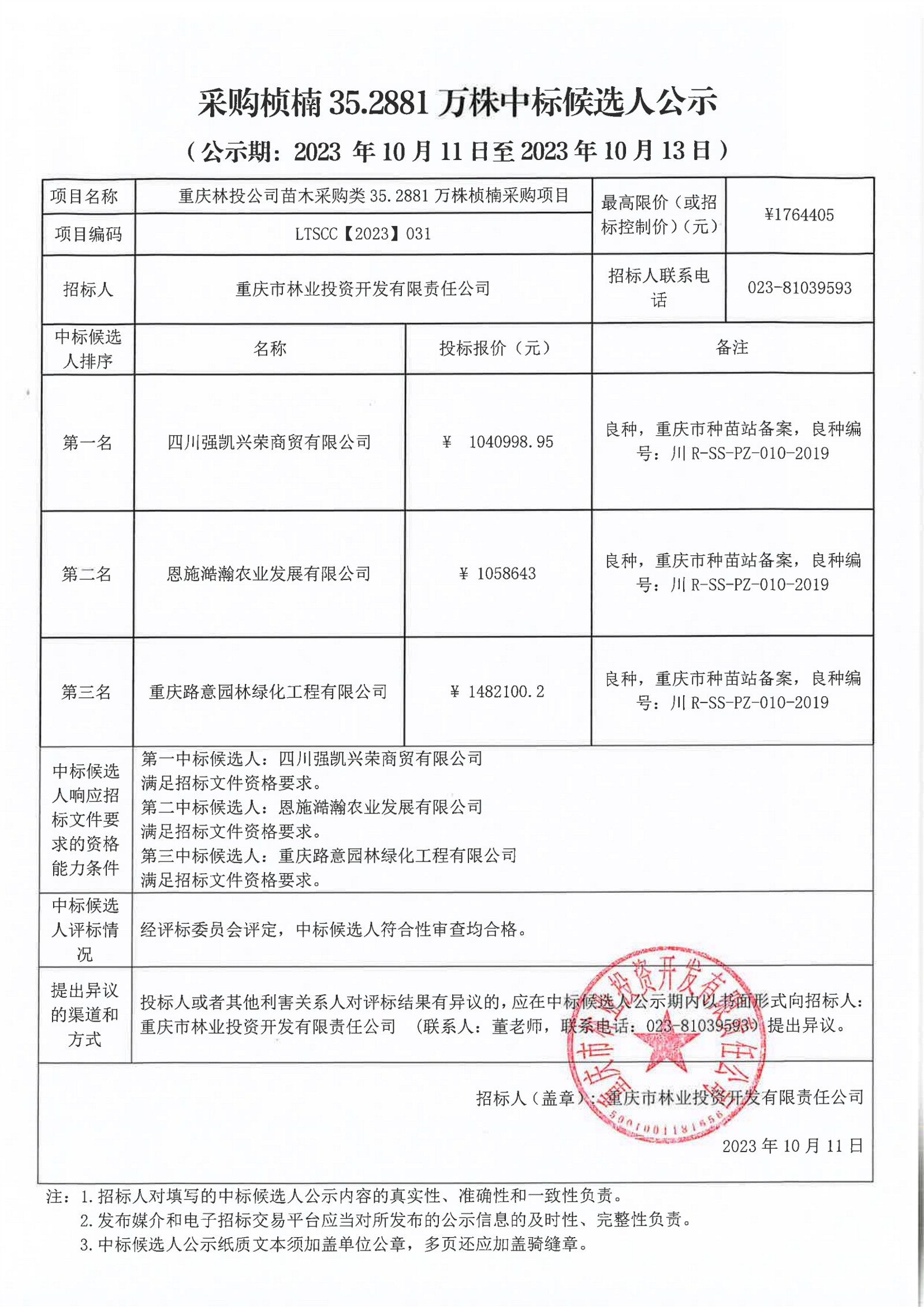 中标候选人公示:重庆林投公司苗木采购类35.2881万株桢楠采购项目采购公告