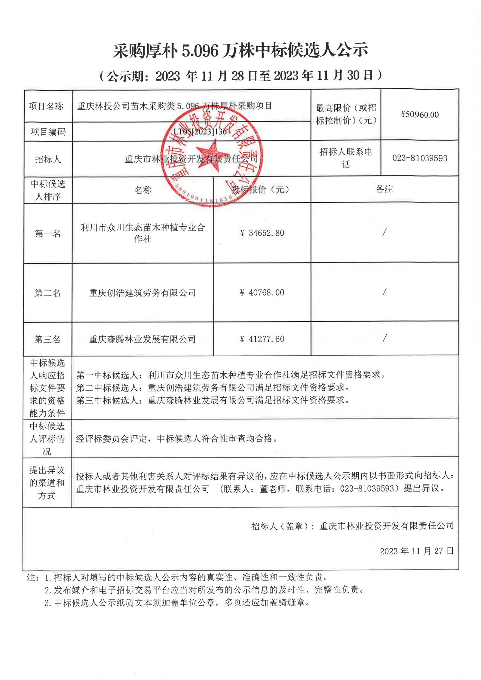 中标候选人公示:重庆林投公司苗木采购类5.096万株厚朴采购项目