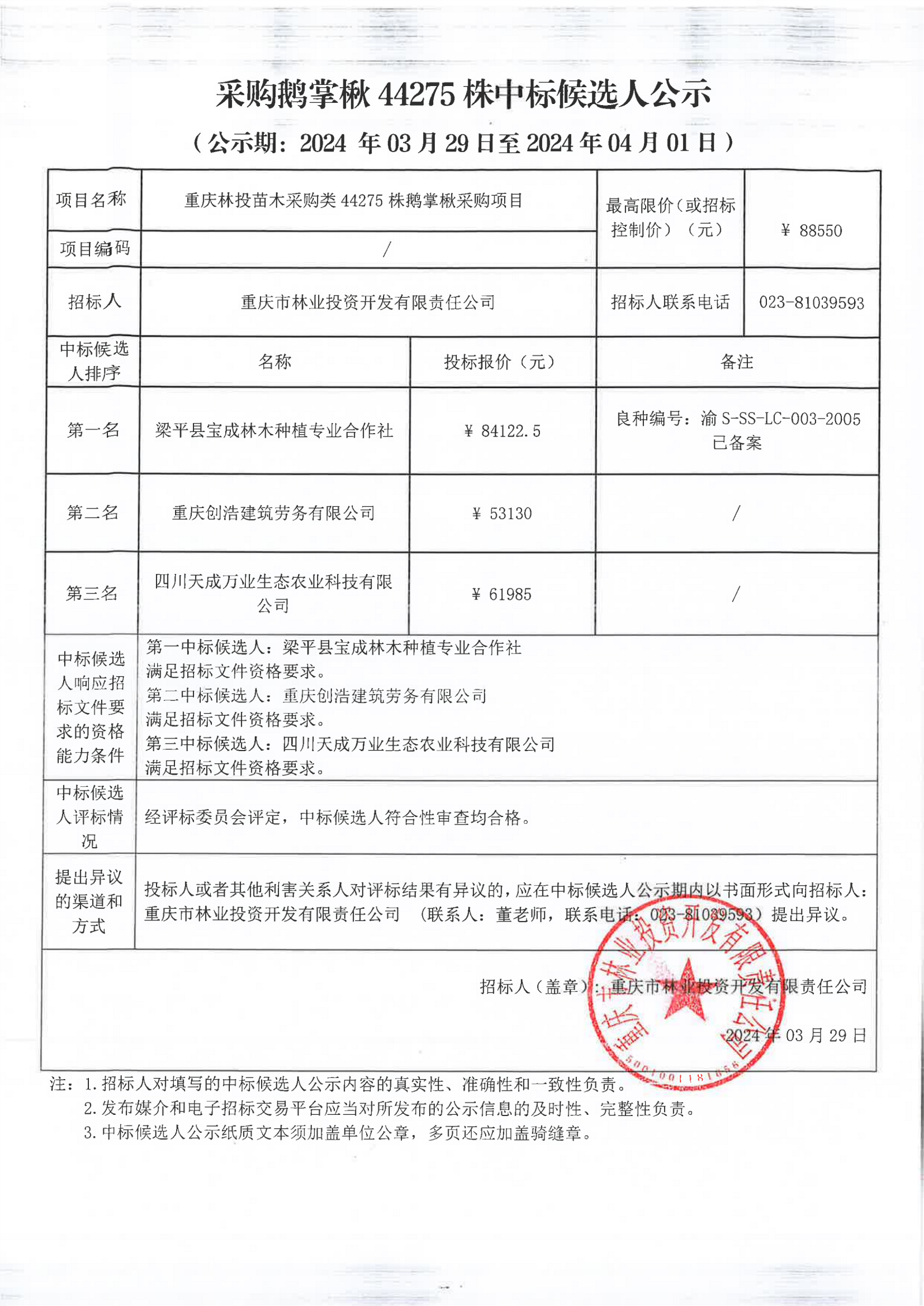 中标候选人公示重庆林投苗木采购类44275株鹅掌楸采购项目