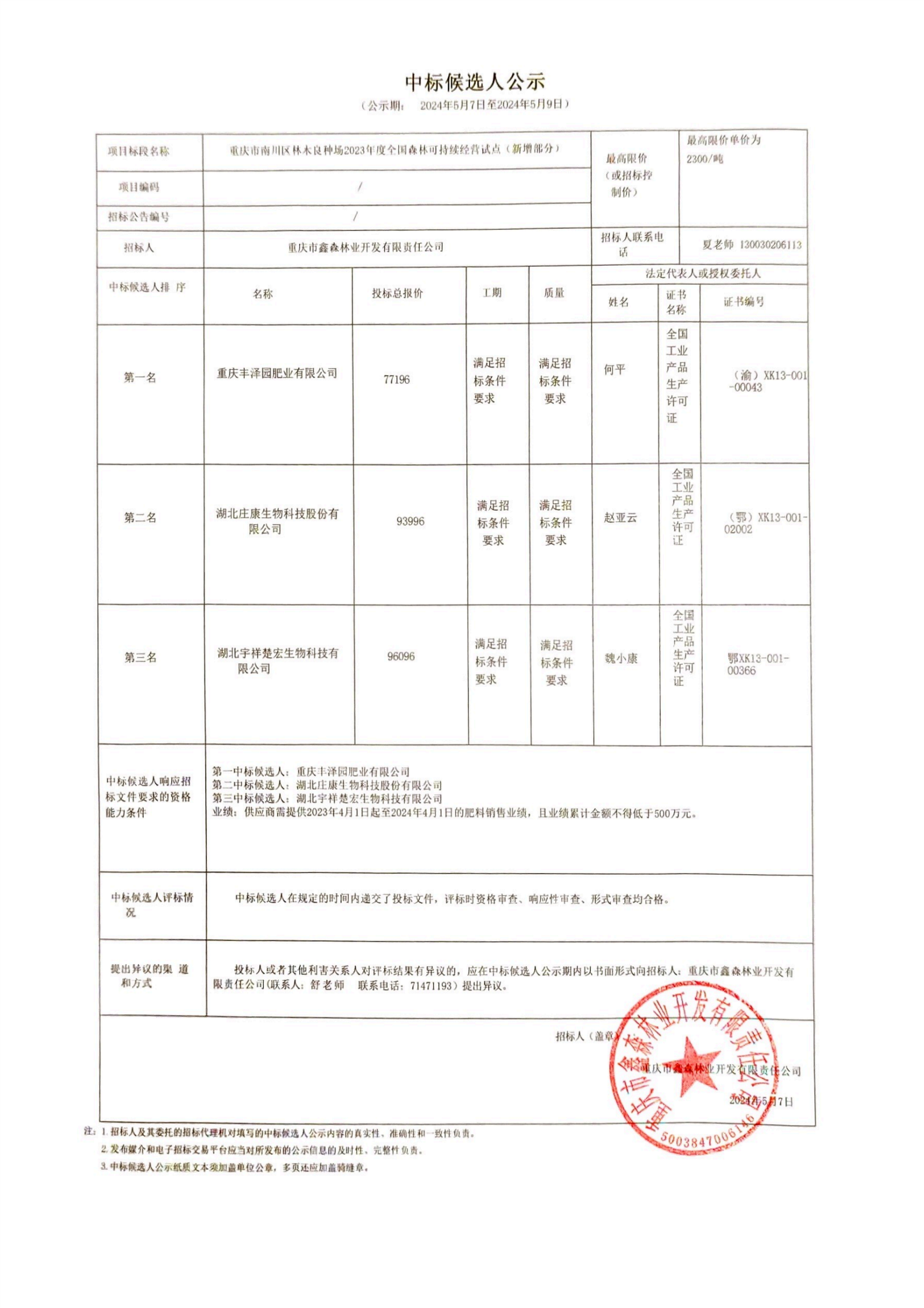 中标候选人公示重庆市南川区林木良种场2023年度全国森林可持续经营试点(新增部分)项目