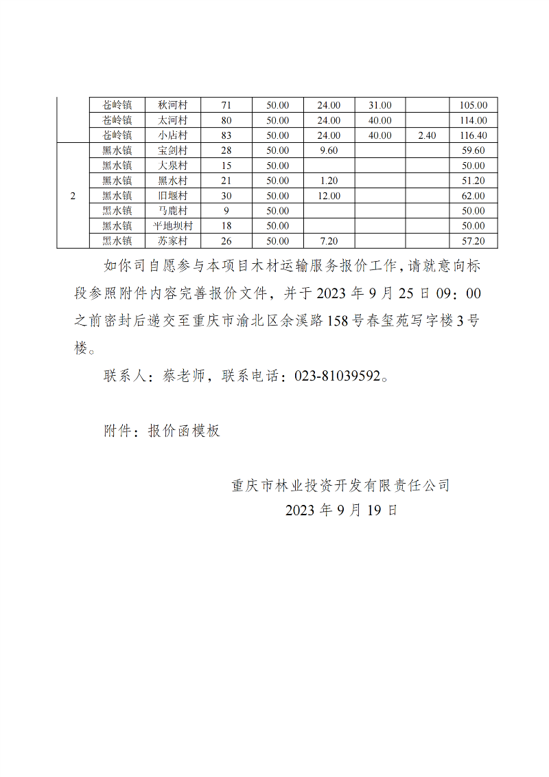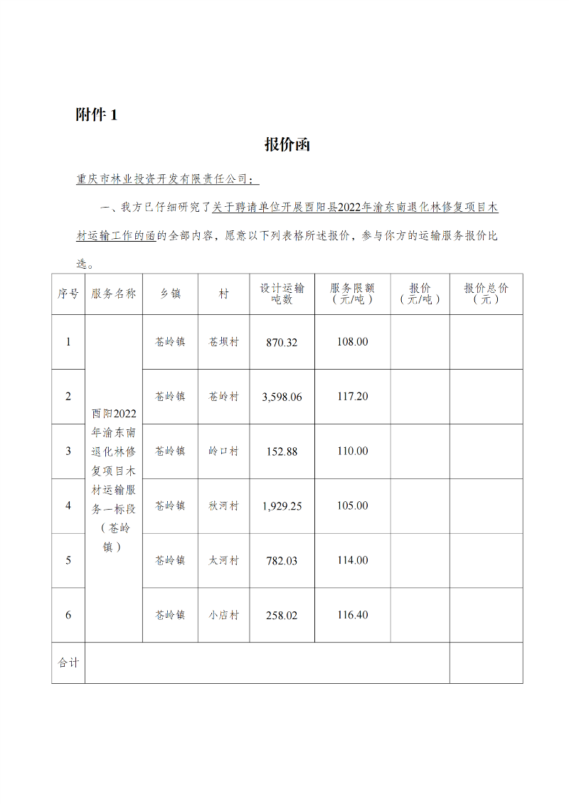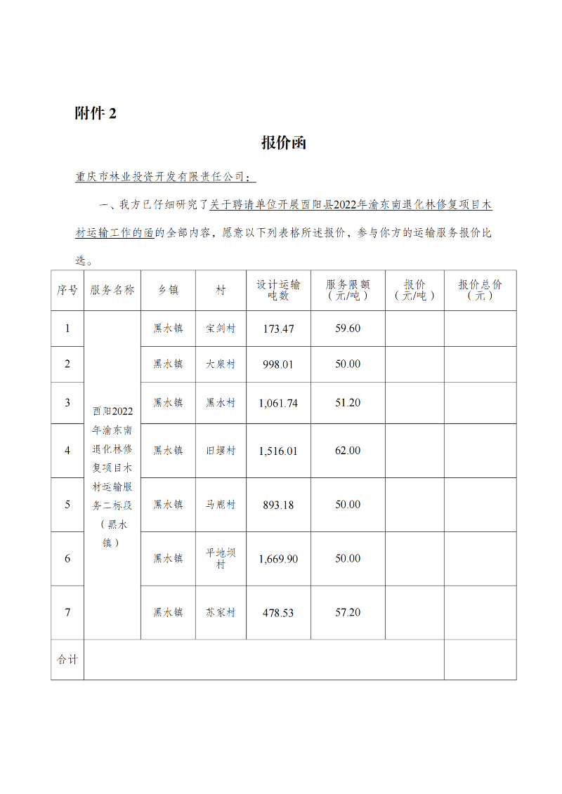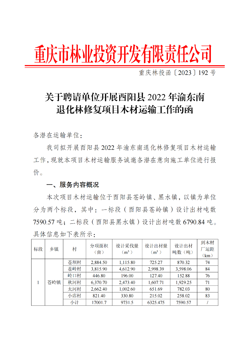 关于聘请单位开展酉阳县2022年渝东南 退化林修复项目木材运输工作的函