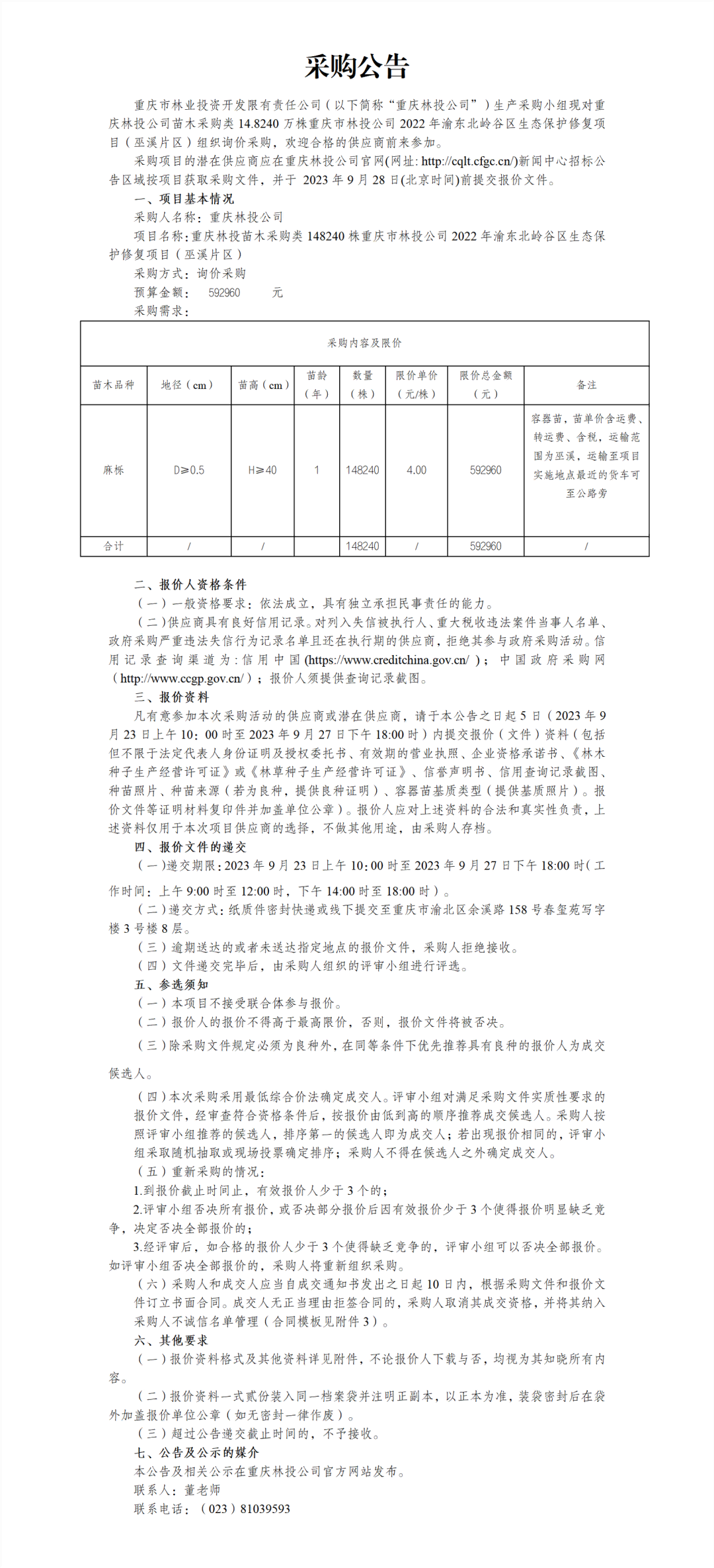 麻栎148240株重庆市林投公司2022年渝东北岭谷区生态保护修复项目(巫溪片区)采购公告