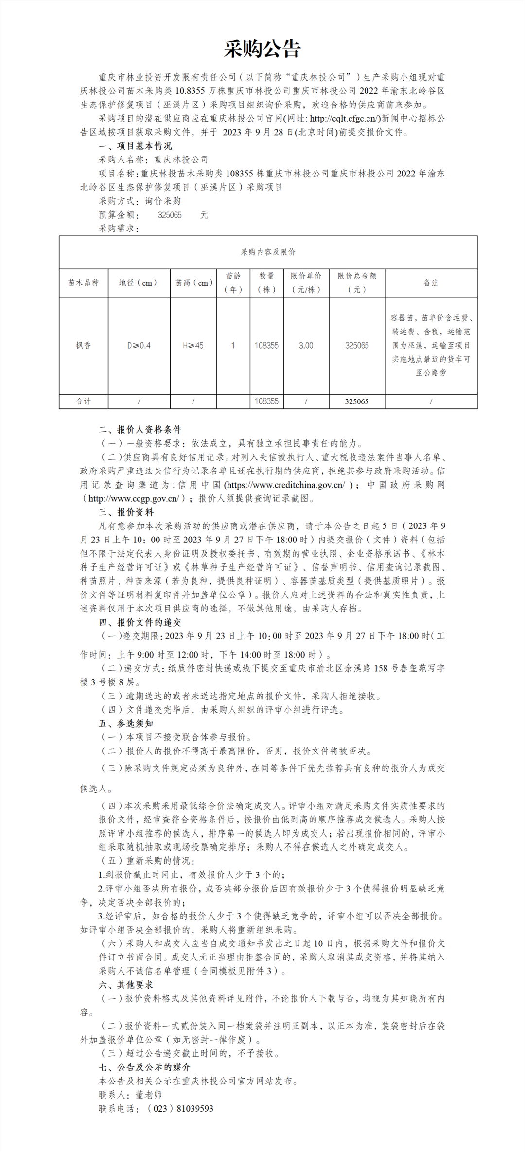 枫香108355株重庆市林投公司2022年渝东北岭谷区生态保护修复项目(巫溪片区)采购公告