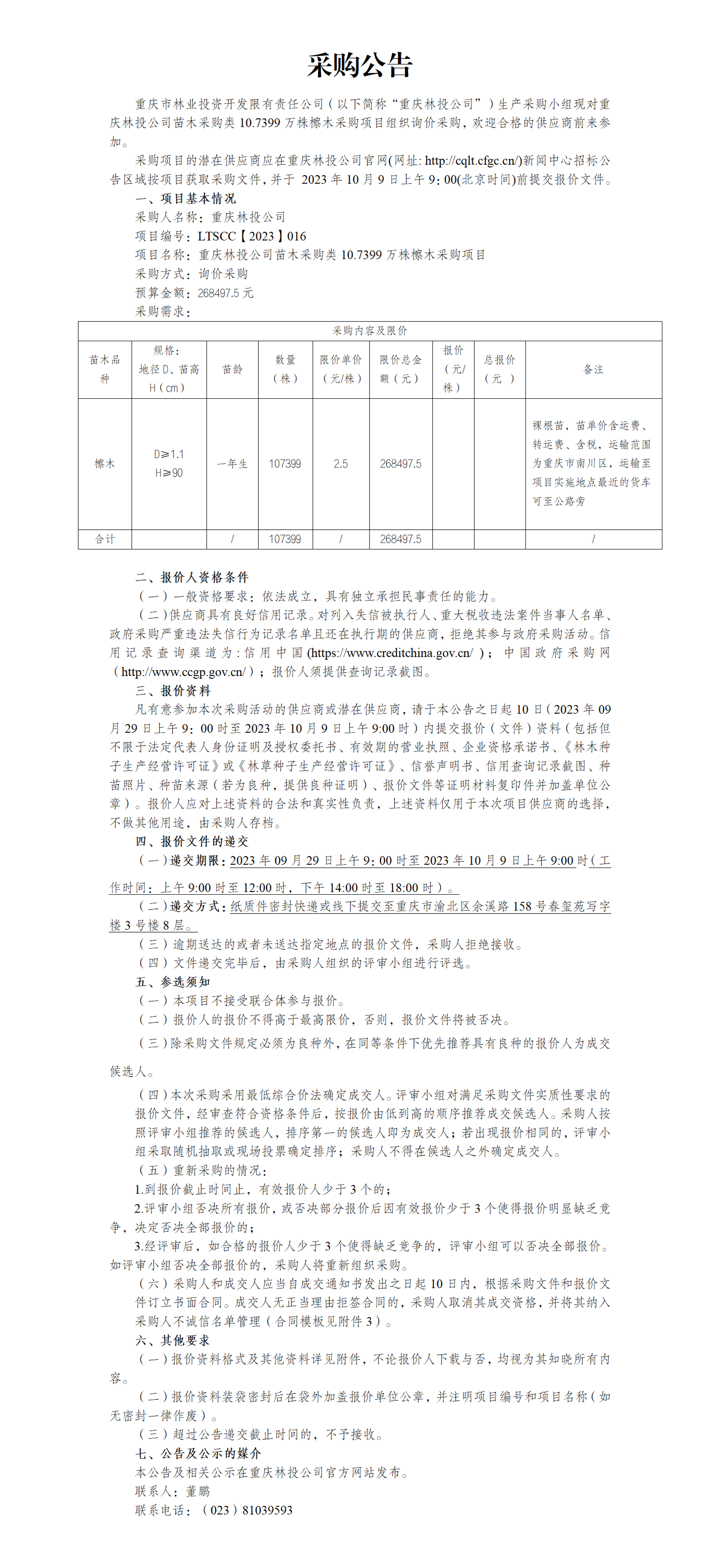 采购公告重庆林投公司苗木采购类10.7399万株檫木采购项目
