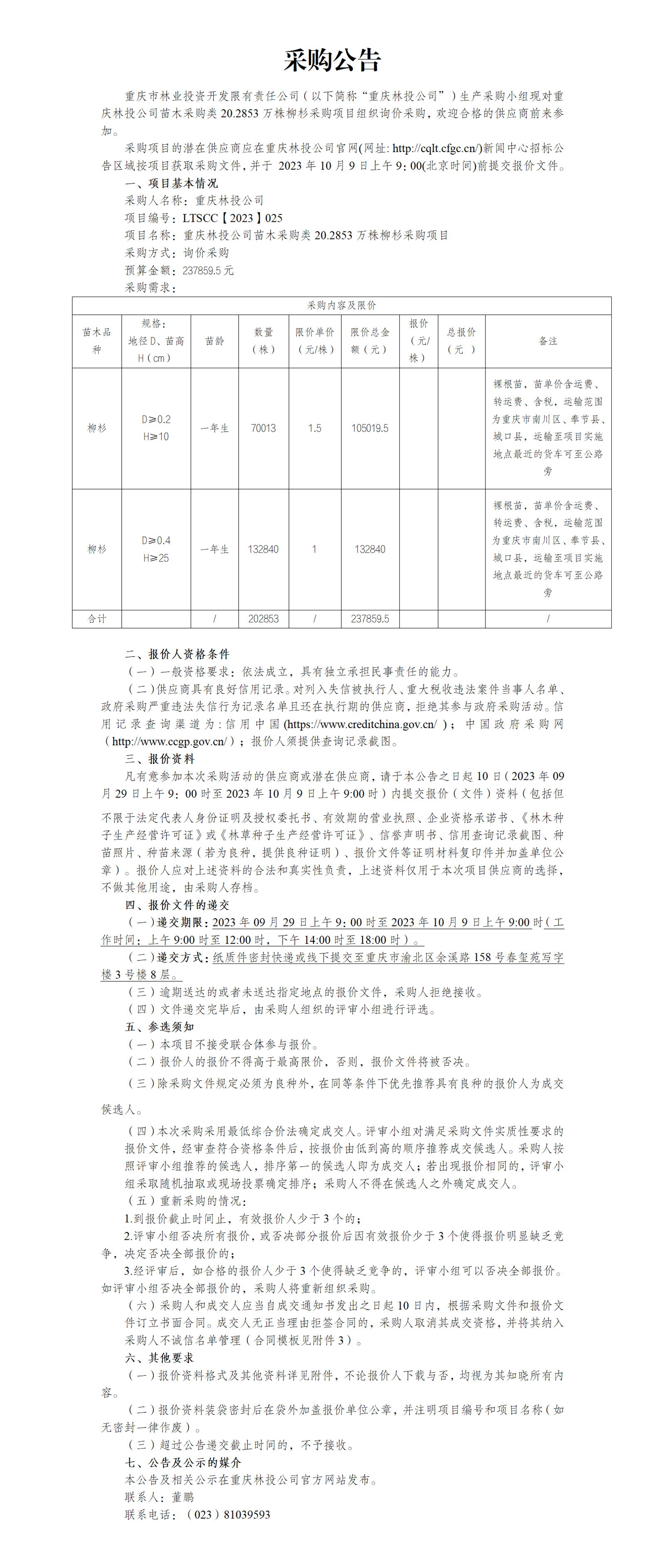采购公告重庆林投公司苗木采购类20.2853万株柳杉采购项目