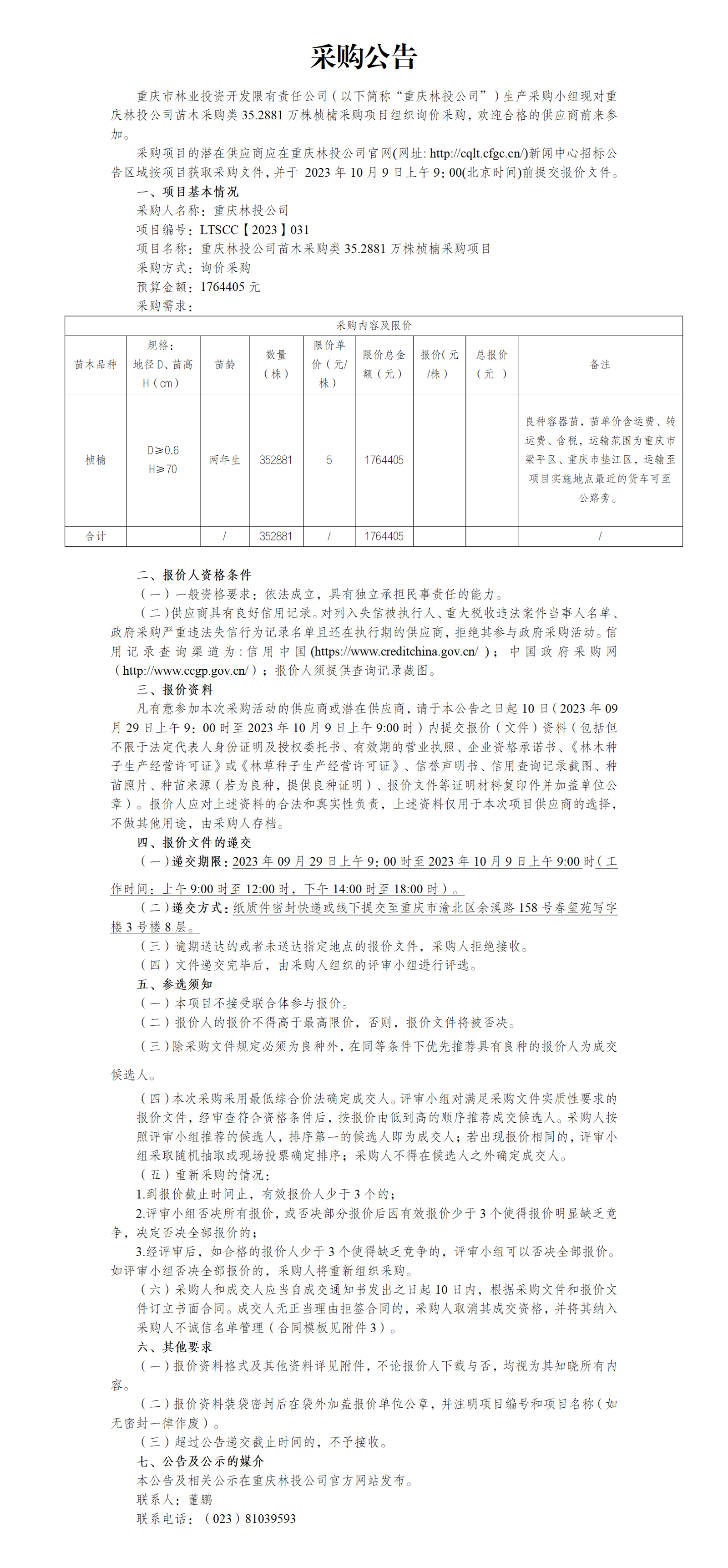 采购公告重庆林投公司苗木采购类35.2881万株桢楠采购项目