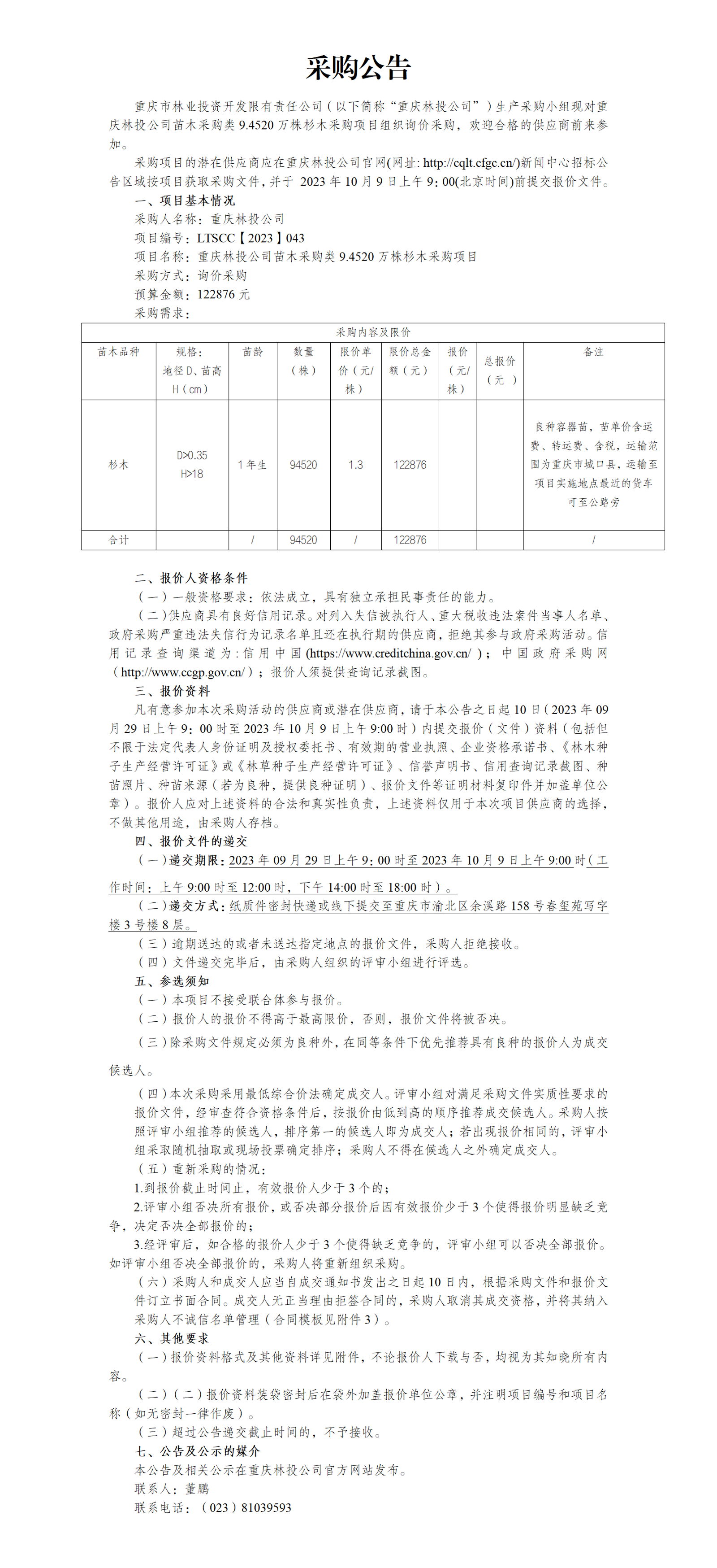 采购公告重庆林投公司苗木采购类9.4520万株杉木采购项目