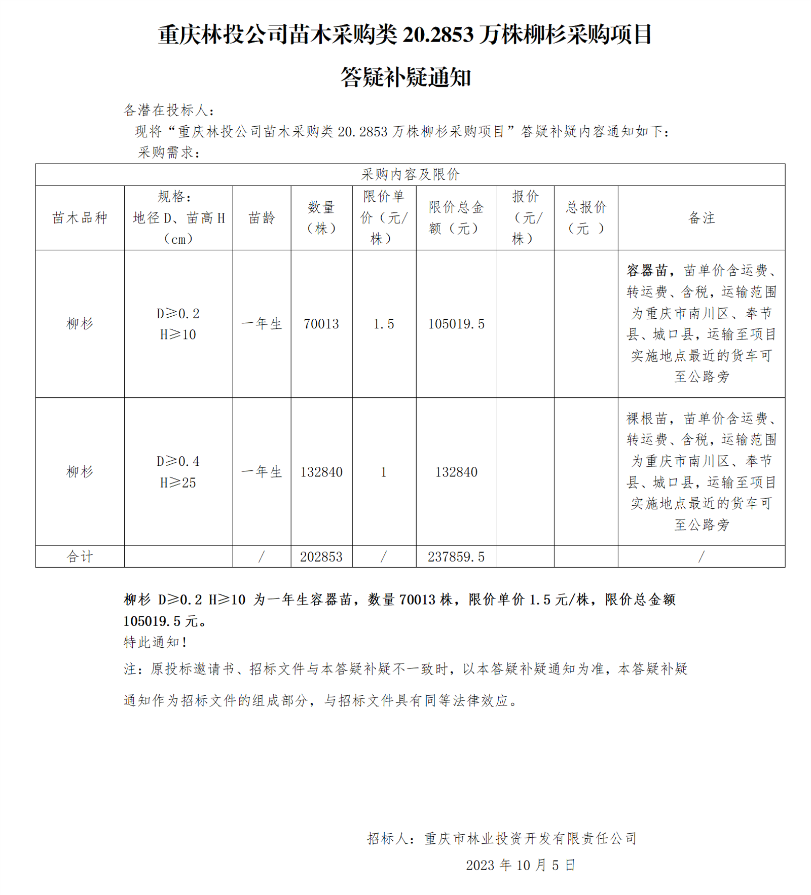 重庆林投公司苗木采购类20.2853万株柳杉采购项目答疑补疑通知