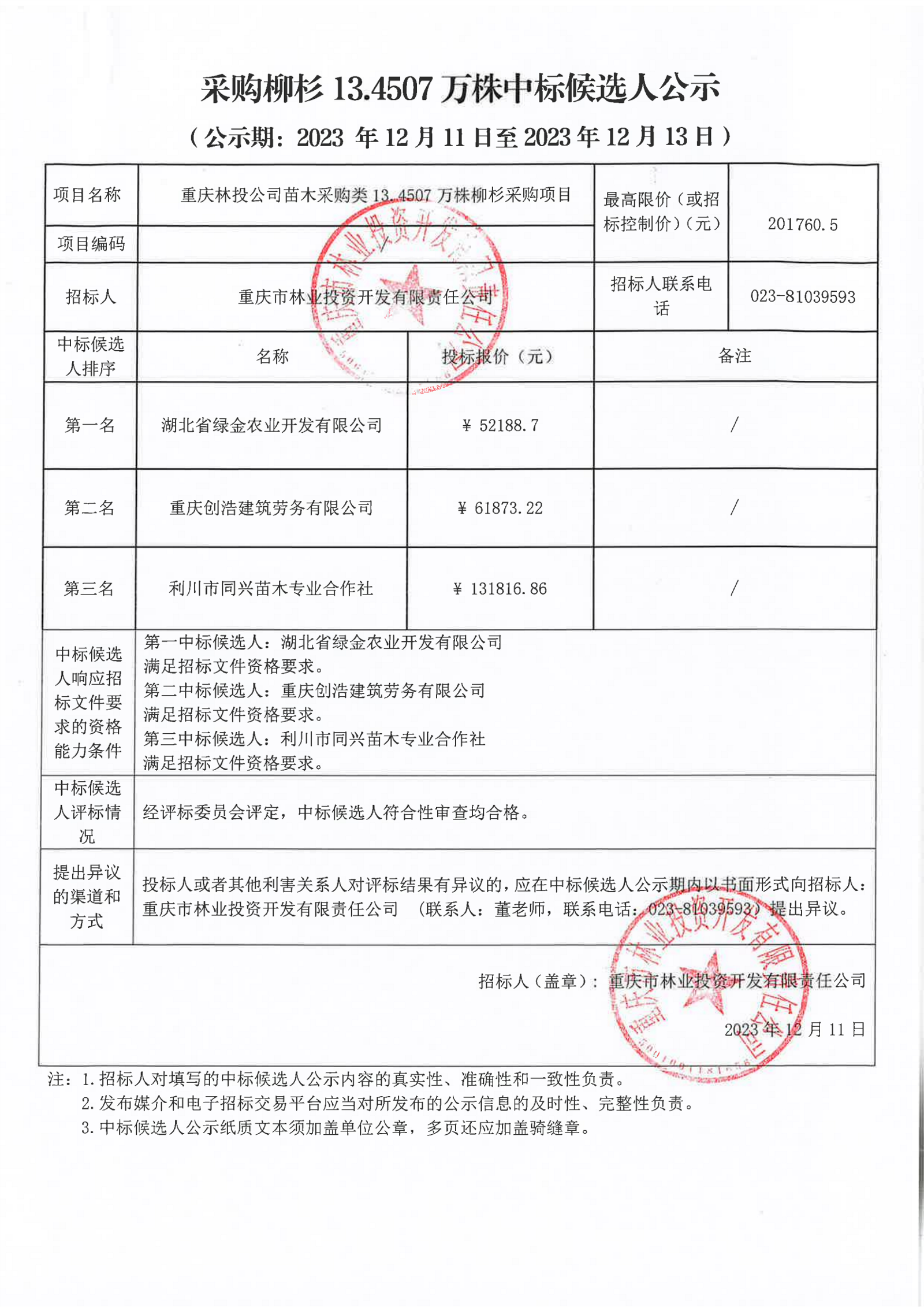 中标候选人公示:重庆林投公司苗木采购类13.4507万株柳杉采购项目