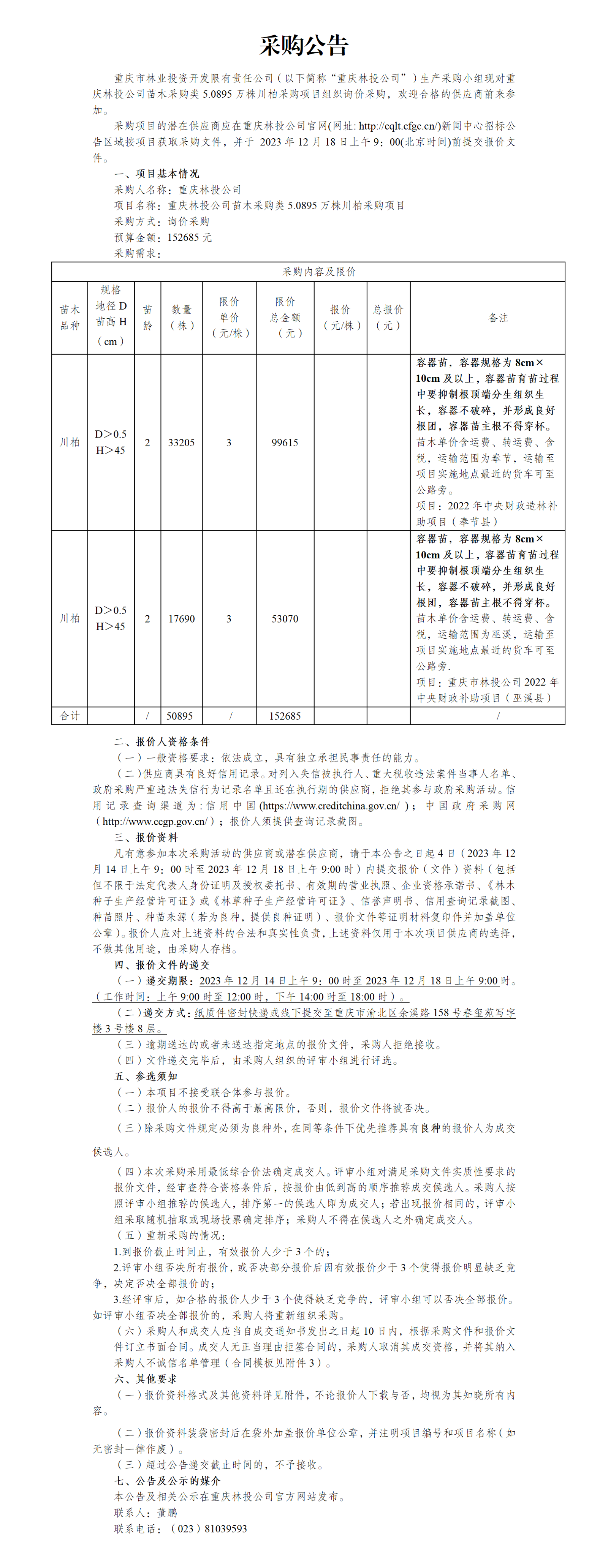 采购公告重庆林投公司苗木采购类5.0895万株川柏采购项目