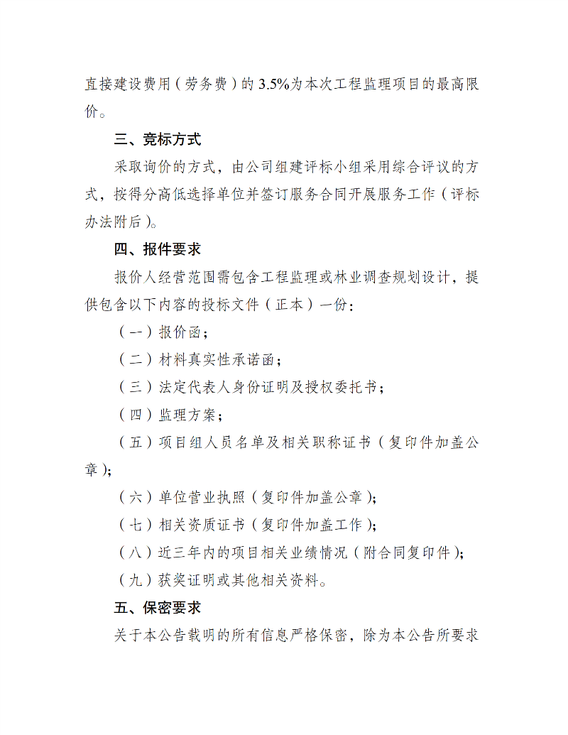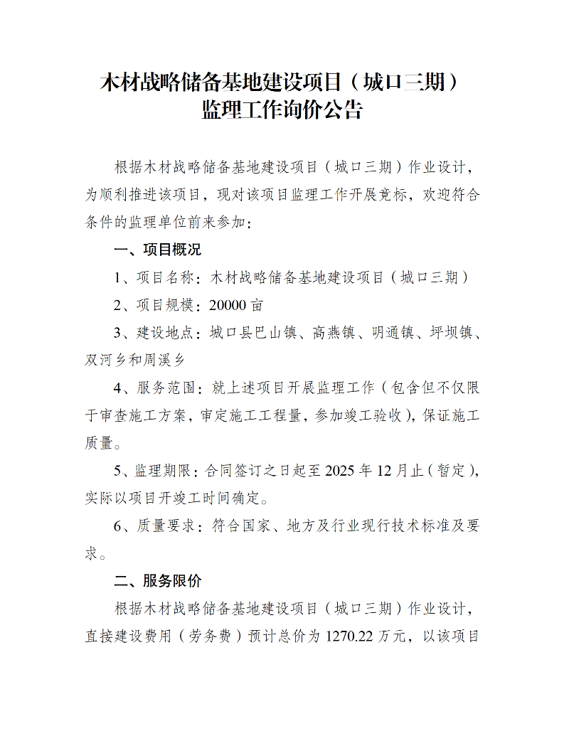 木材战略储备基地建设项目(城口三期)监理工作询价公告