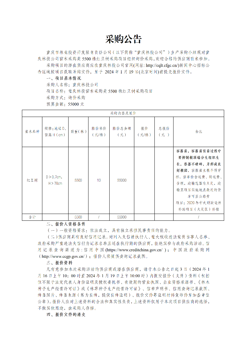 采购公告:重庆林投苗木采购类5500株红豆树采购项目