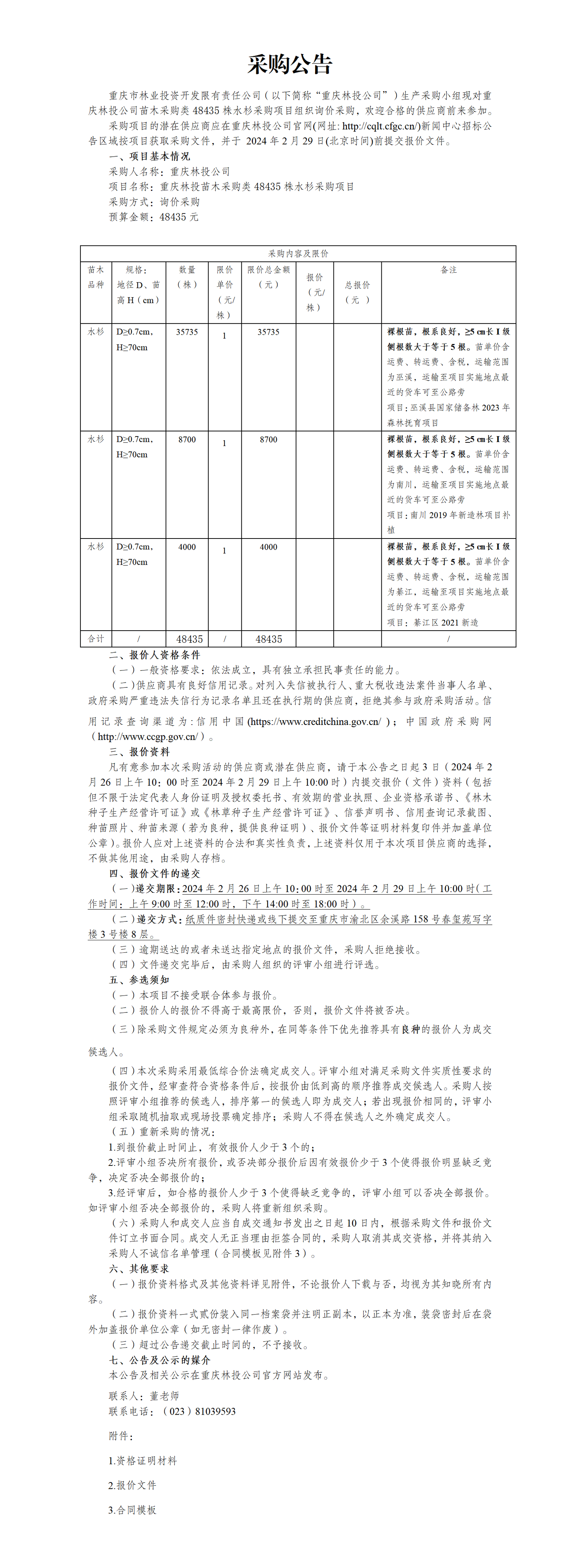 重庆林投公司苗木采购类48435株水杉采购项目