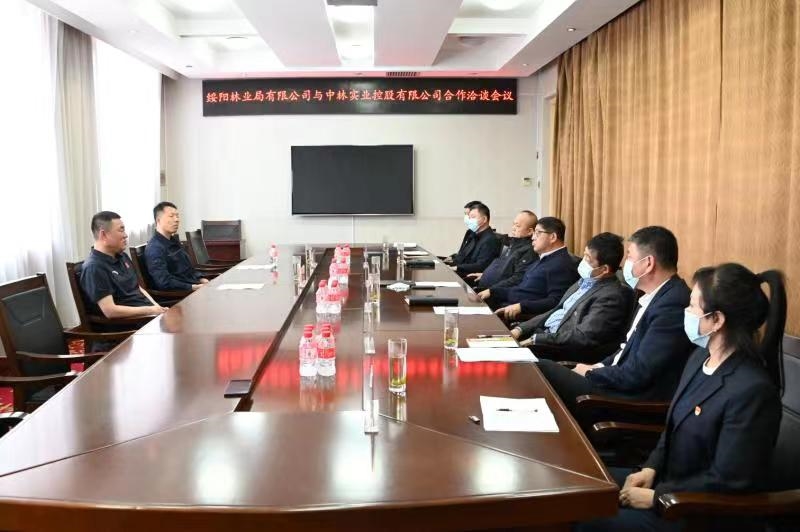 张新华对陈永广一行的到来表示热烈欢迎。他介绍了绥阳林业局得天独厚的地理位置优势和施业区内丰富的森林资源、土地资源、山副特产资源、野生动植物资源、矿产资源,以及现有的自然旅游风景区等,特别对双桥林场“国家级森林康养基地”进行了详细介绍。他表示,绥阳林业局希望能与中林实业在木耳深加工、森林康养旅游等领域建立合作,愿以绥阳林业局最优质的林业资源融入中林集团“中林好山水”“中林好食材”品牌集群中,带动绥阳林业局绿色产业飞跃式发展。