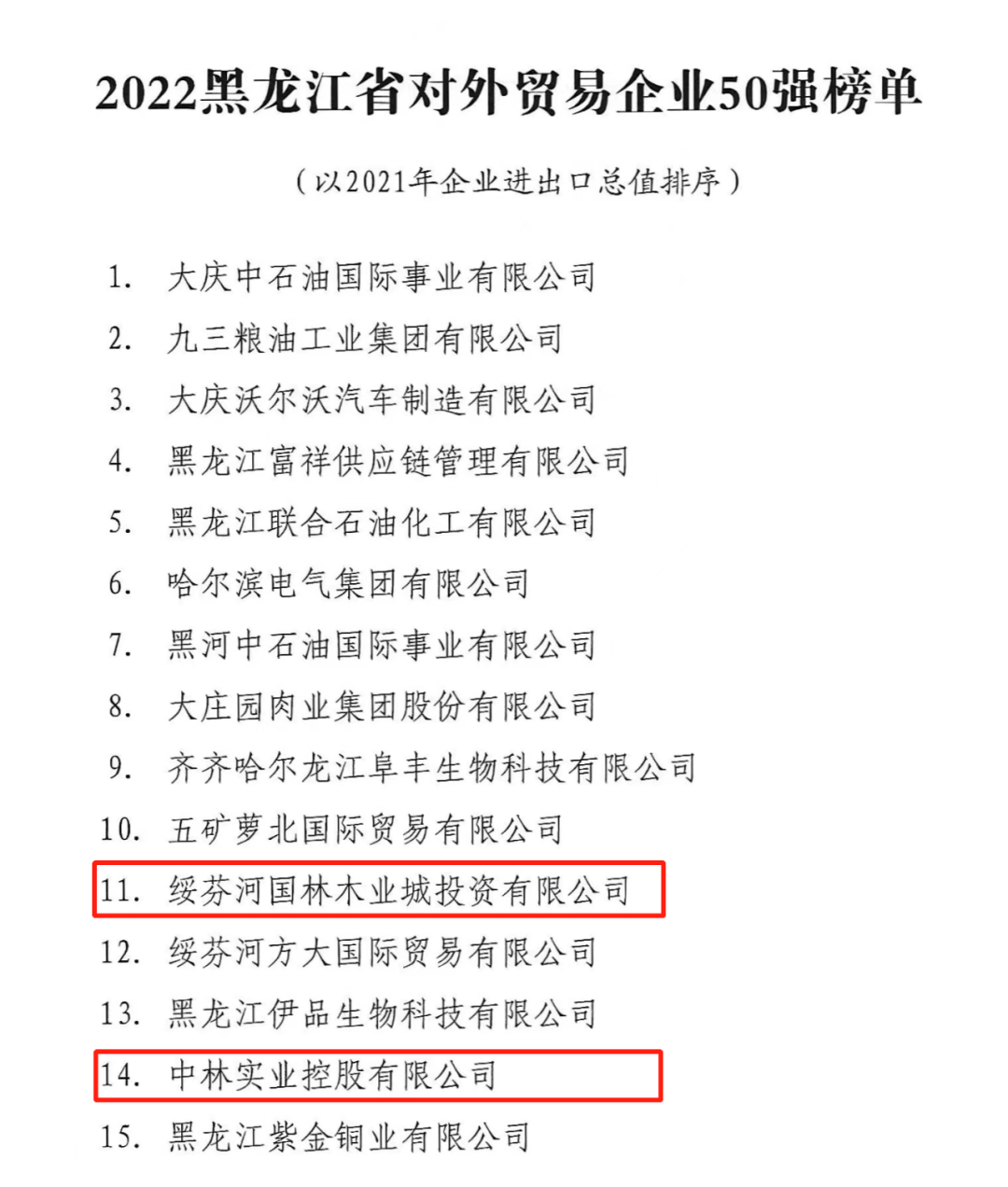 近日,《2022黑龙江省对外贸易企业50强榜单》在全省开放发展大会上发布。榜单依据2021年企业进出口总值排序,中林实业控股有限公司及下属绥芬河国林木业城投资有限公司分别位列榜单第14位和第11位。