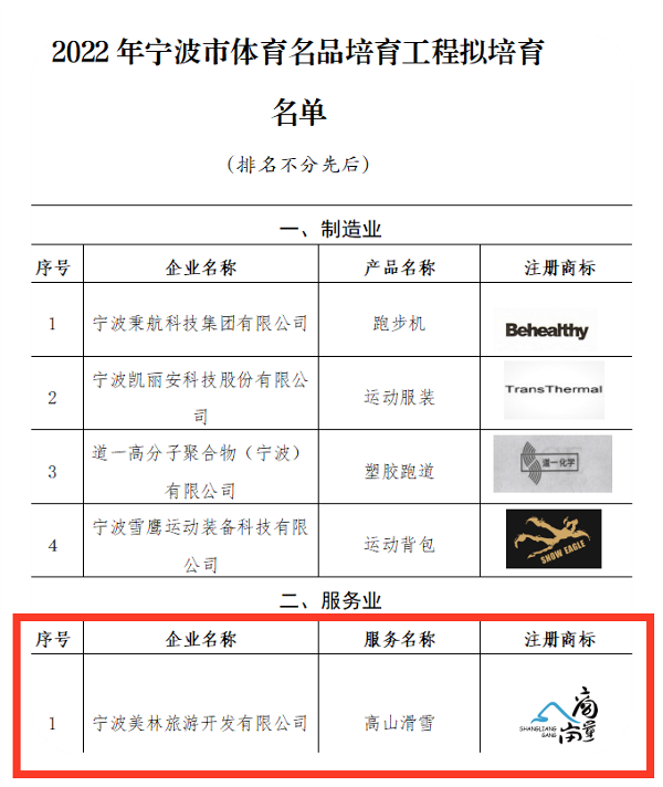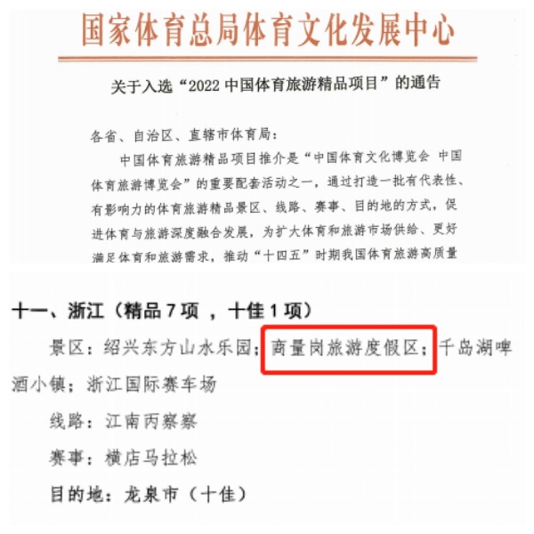日前,国家体育总局体育文化发展中心、浙江省林业局、宁波市体育局(体育总会)等单位陆续发布项目评选公告,公司所属的中林·商量岗旅游度假区再获多项殊荣,陆续被评为“2022中国体育旅游精品项目”、“2022年浙江省森林康养基地”,度假区内的高山滑雪项目入选2022年宁波市体育名品培育工程名单,培育期三年。