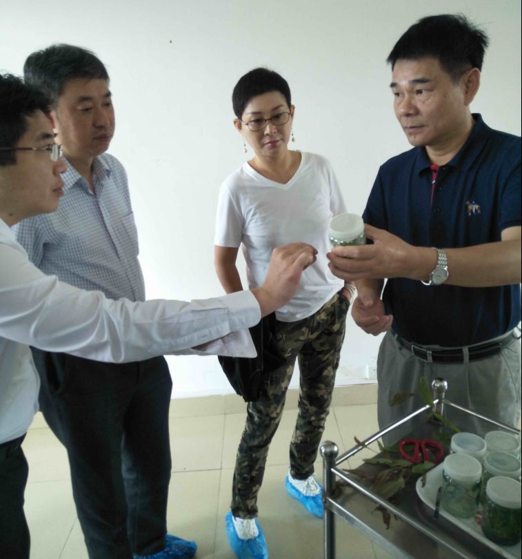 冀宝钧一行首先到组培室参观组培苗生产的工作情况,对组培苗生产有个轮廓般的了解,接着庞统书记带领他们到组培预备室,详细介绍了从一根枝条到整株树苗的组培繁殖过程。庞书记深入浅出的介绍引发冀宝钧一行人的浓厚兴趣,不时地提出疑问,庞书记也一一答疑,其中提到最多的、也最不可思议的就是“一个芽条怎样变成十万甚至百万株的苗木?”庞书记解释道,这是关键所在,也是雷林公司掌握的核心技术。雷林公司掌握桉树组培三种类型培养基配方,分别有:外植体植入配方、继代增殖配方、生根配方。就是依靠这些配方的配合使用,才能形成今天的规模。