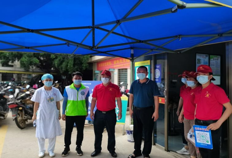在卫生院内鲜艳的红色志愿者衬衫格外耀眼。分公司党总支书记、经理蔡华杰带领党员志愿者顶着烈日协助医务人员为前来接种疫苗的群众提供现场协诊咨询、秩序维护、送口罩、送水、测温亮码、信息登记等服务工作,为前来接种的群众办实事、解难事,提高群众疫苗接种效率。